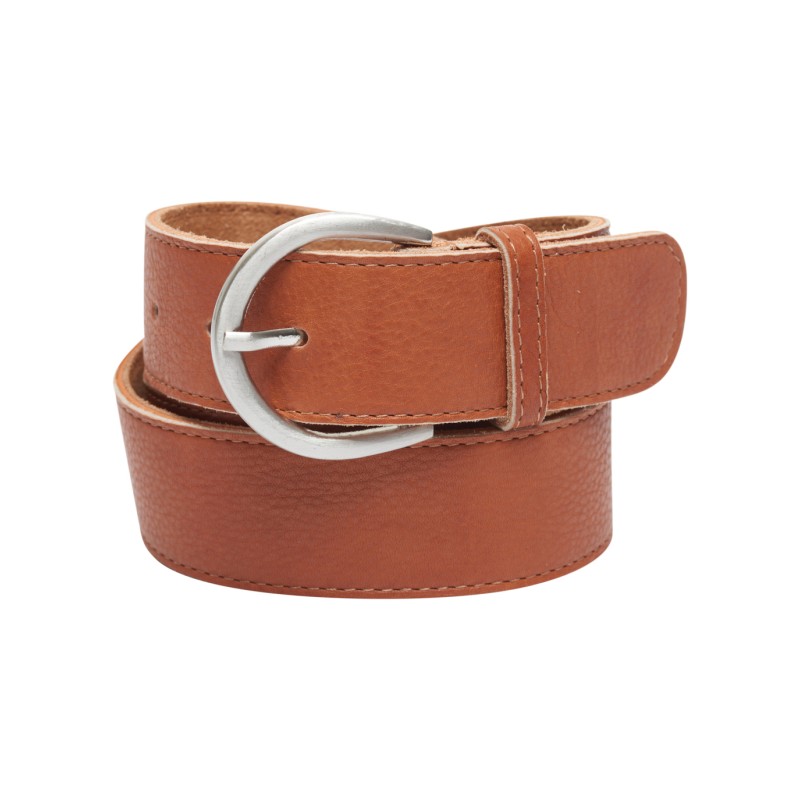 Cognac farvet jeans bælte med sølv spænde. Bæltet er 3,2cm bredt.