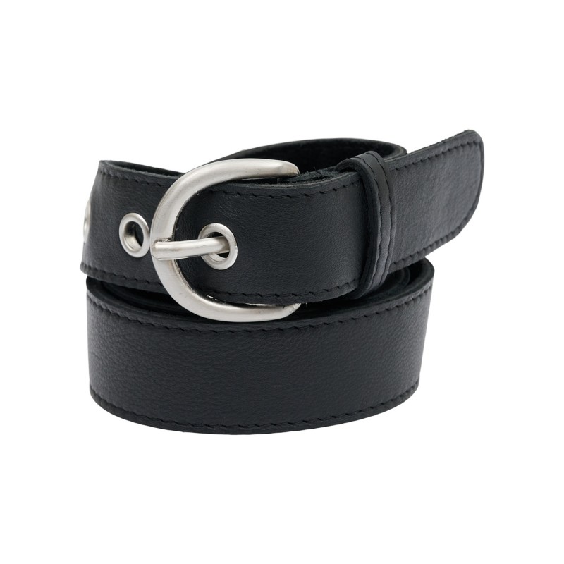 Sort 3,2cm bredt, justerbart jeans bælte med sølv spænde og sølv nitter.