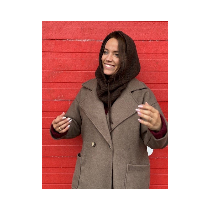 Smart ribstrikket hætte og tørklæde i et til at style dit overtøj eller bluse med. Hætten har en løs pasform og har en snøre i løbegangen, så den kan snøres ind.