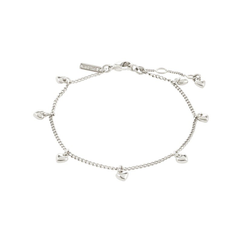 Slankt sølvbelagt curb chain armbånd med otte tiny hjertevedhæng, der skaber et cute romantic look. De små hjerter tilfører et playful touch til dit outfit og gør armbåndet perfekt til både hverdag og særlige moments. Brug det alene for et delikat statement eller mix med flere armbånd for en trendy stacked vibe. Dit nye go-to piece for effortless romance! Fremstillet af 99% genanvendt materiale med kærlighed til planeten.