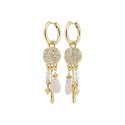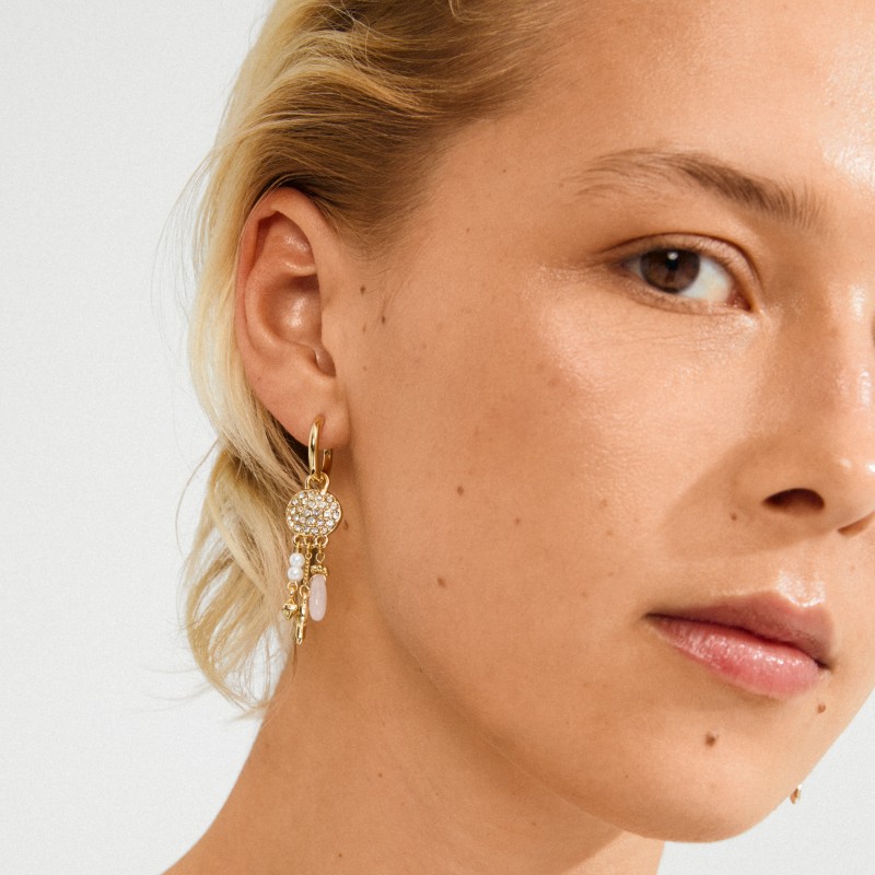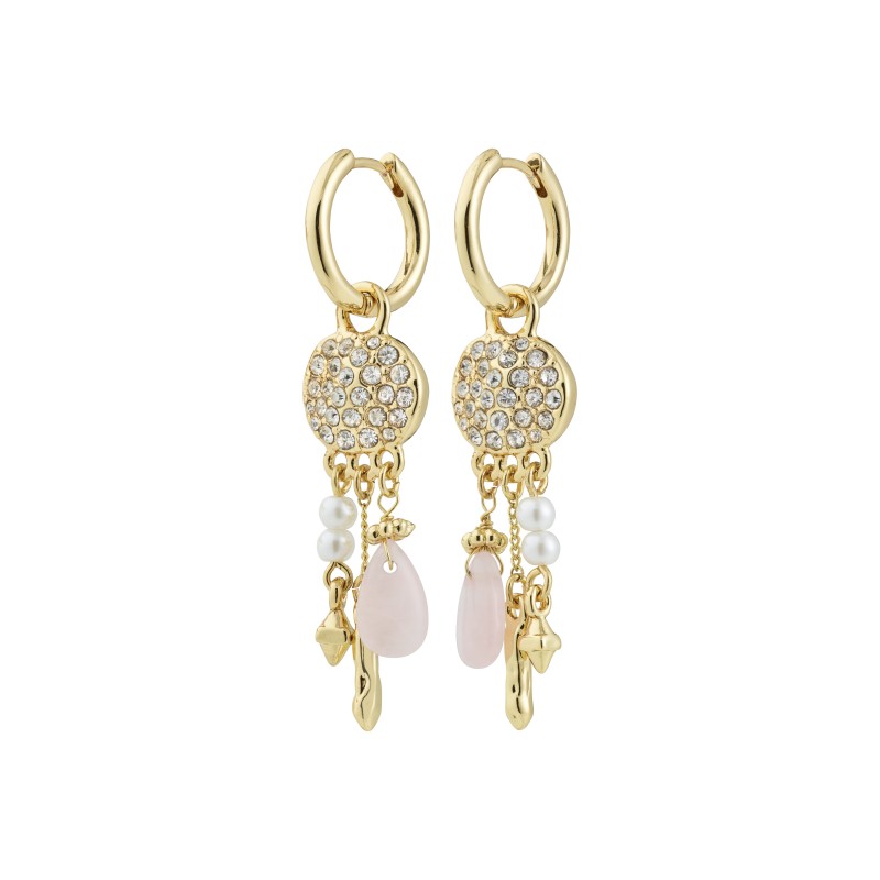 Feel the SHIFT, embrace the magic! De guldbelagte SHIFT hoops fra Pilgrims Moments of Change-kollektion, giver dit look en sweet whimsical feel. Små coin-vedhæng, dekoreret med glitrende Preciosa-krystaller, reflekterer lyset magisk, mens perlemorsfarvede glasperler og kærlighedsstenen Rosenkvarts skaber et breezy, free-minded feel. En playful kombi af detaljer, der giver dit look en unik og drømmende energi. Fremstillet af 84% genanvendt materiale – smykker med omtanke.