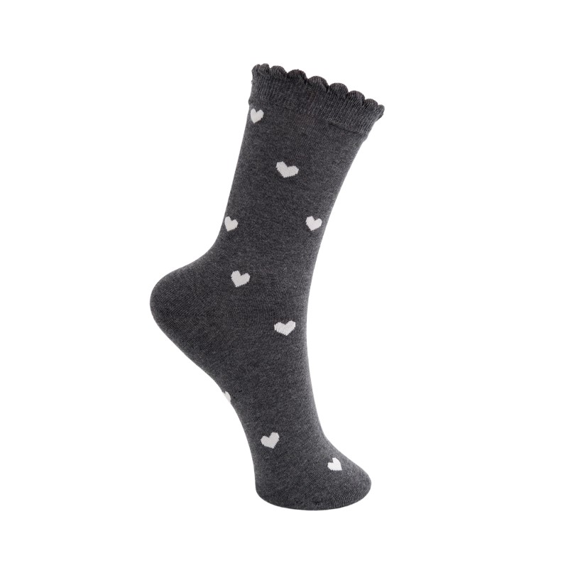 Æsken indeholder 3 par strømper med hjerter. Et par grå med hvide hjerter, et par beige med sorte hjerter og et par sorte med hvide hjerter. Perfekt at give som gave.