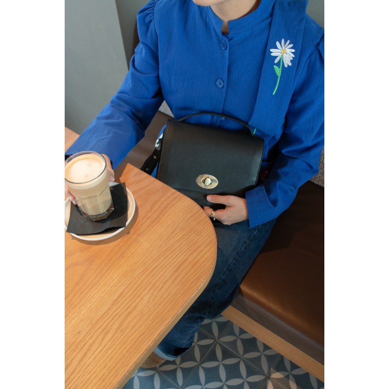 Tasken har et klassisk design med et håndtag på toppen, og en dekorativ messingfarvet drejelås på fronten.