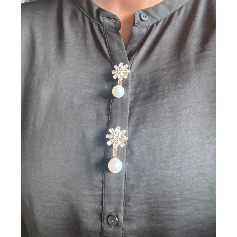 Flot cover i guld der ligner en blomst og har en fin perle hængende ned. Perfekt til at shine knapper på skjorten op. Sælges som sæt med to styk.