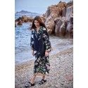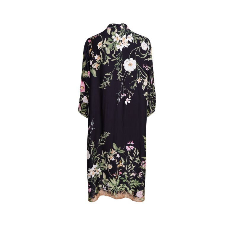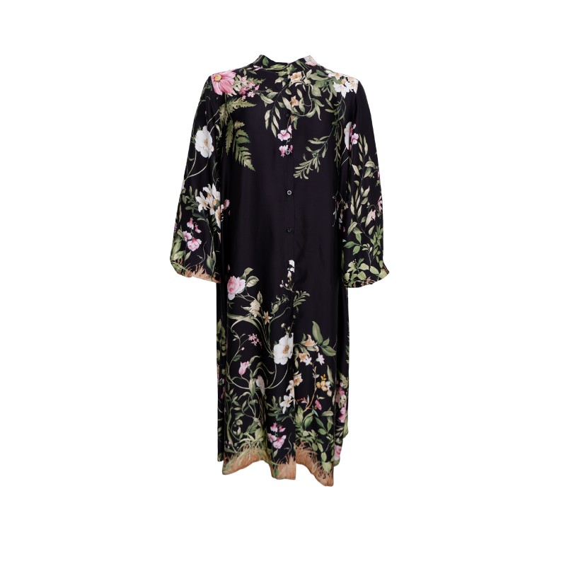 Zennia er en lang kjole i glansfuldt viskose med et smukt blomsterprint i bløde farver. Kjolen har knaplukning foran, elastik ved håndleddene og en elegant, løs pasform. Perfekt til både hverdag og festlige lejligheder.