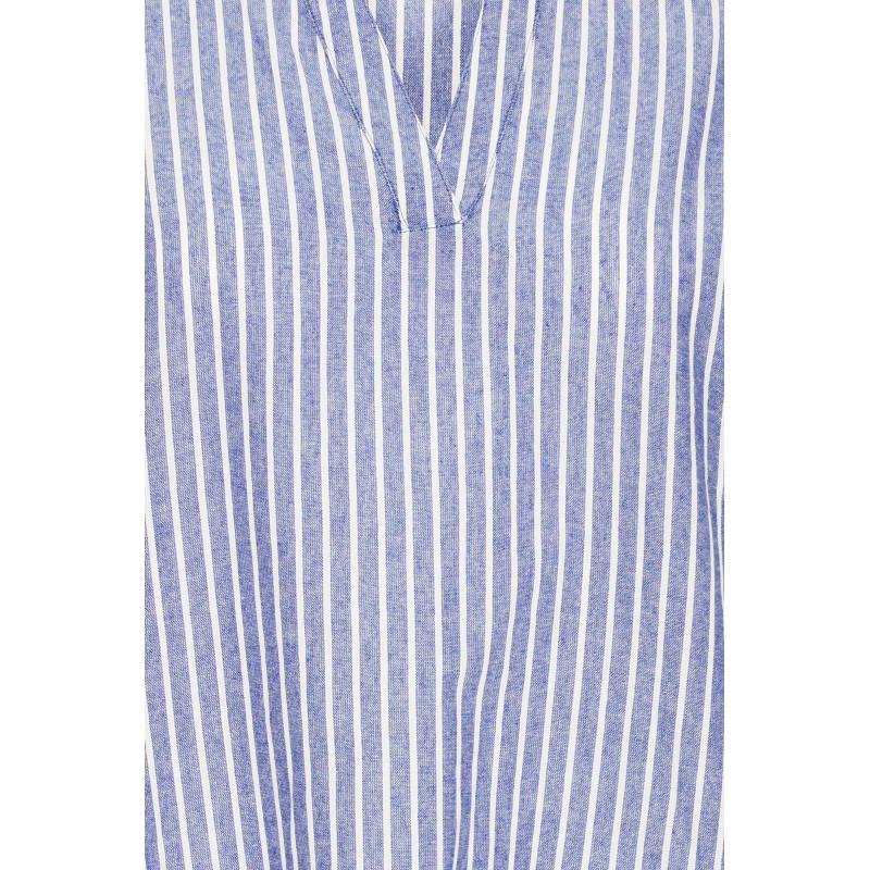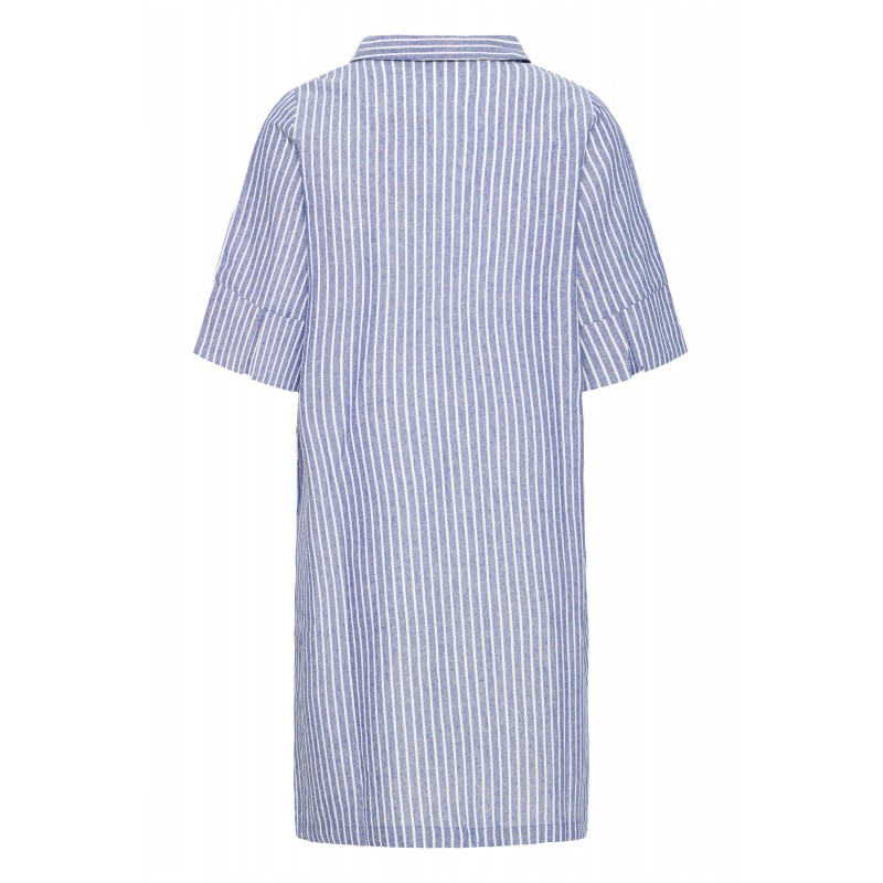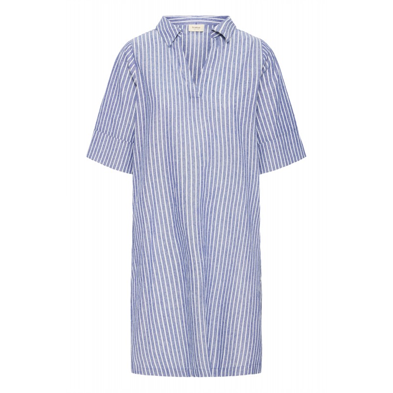 Stribet kjole til damer med afslappet pasform, V-hals og knælængde. FRBONNIE er med korte ærmer, diskret krave og sidelommer perfekt til hverdag og fest.
