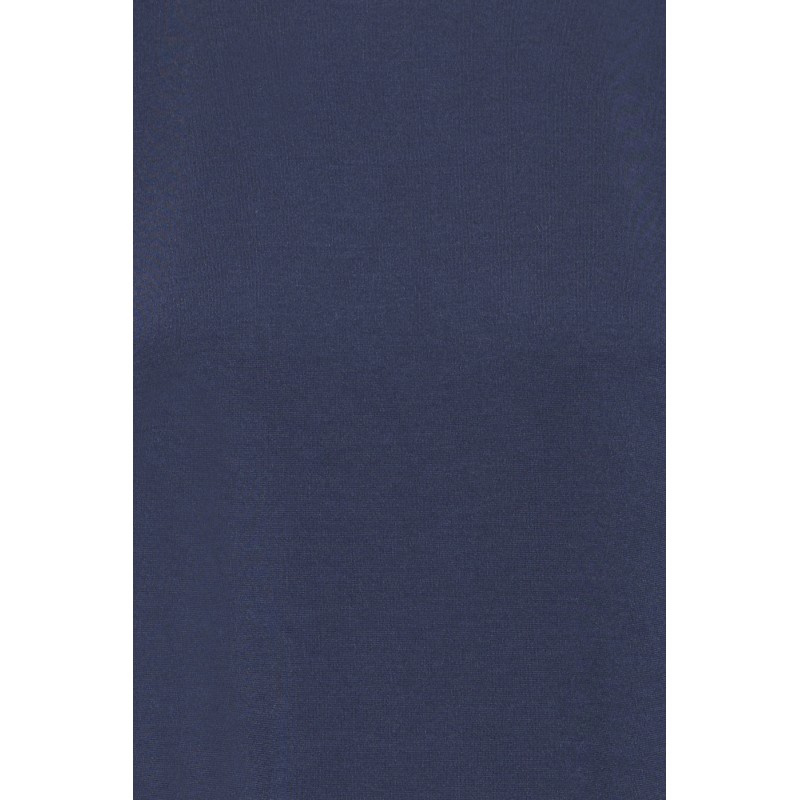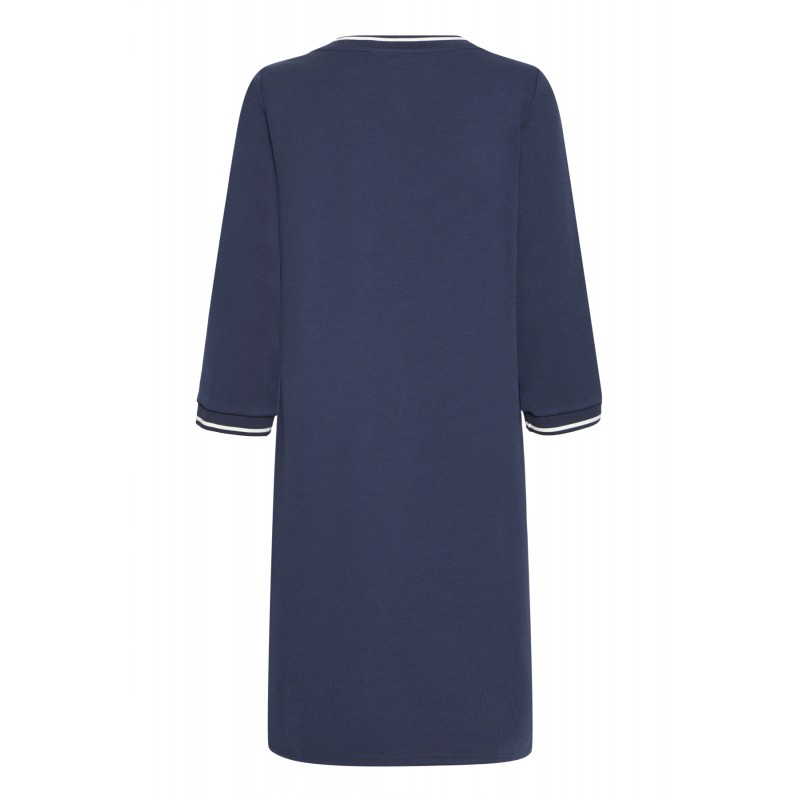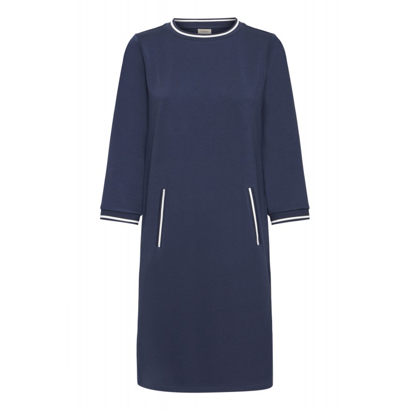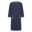 Smart blå jersey kjole fra Fransa med rund hals og 3/4 lange ærmer. Både halsen og ærmerne har en ribkant med en hvid kontrast stribe.