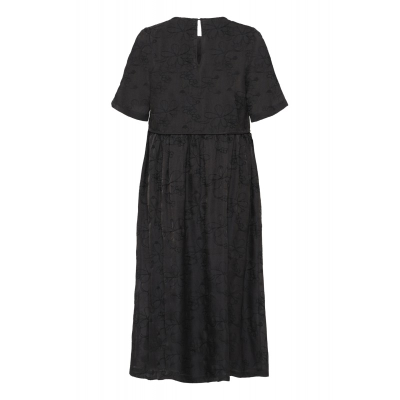Fantastisk kjole fra Ichi. Kjolen har et smukt blomster broderi, rund hals og korte ærmer. Kjolen er transparent, så der medfølger en sort underkjole.