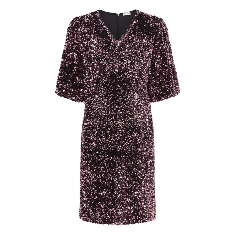 Smuk kjole fra Pulz med pallietter. PZLOLLIE kjolen har en feminin pasform med v-udskæring, korte ærmer og en længde til lige over knæet.