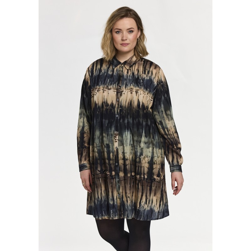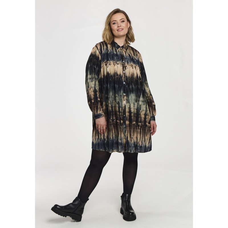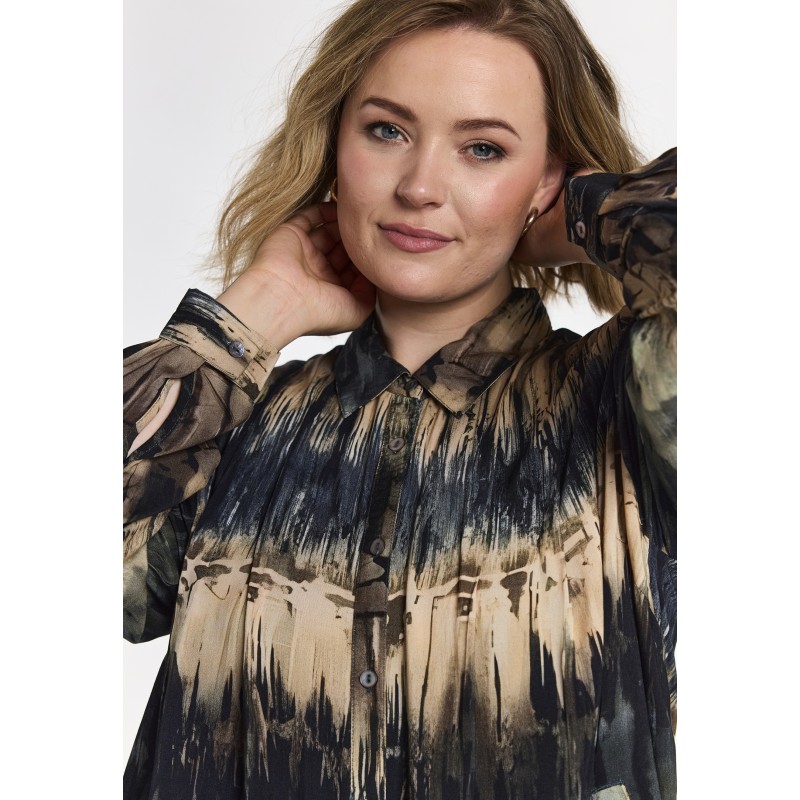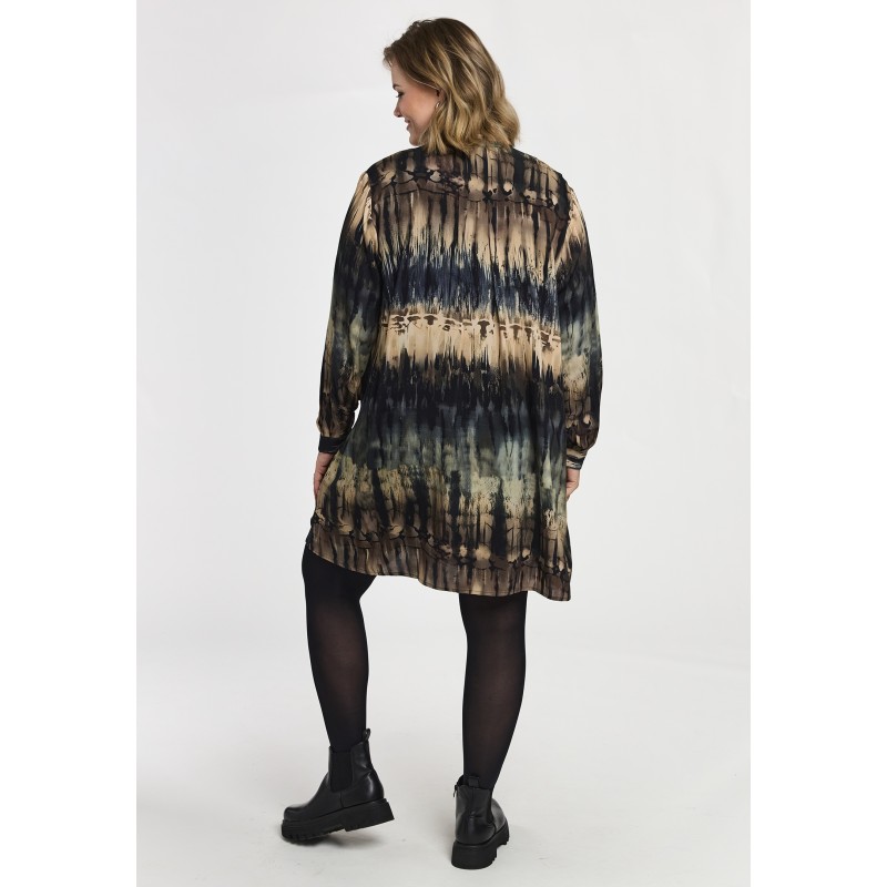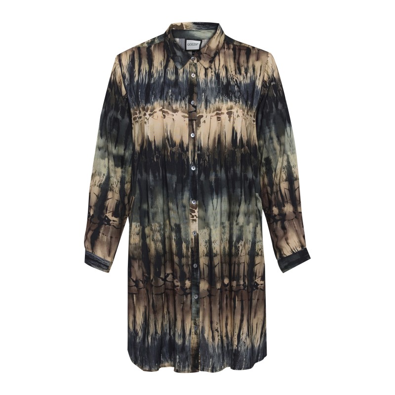 GBirla er en tunika fra Gozzip med abstrakt stribeprint i grønne/blå og beige toner, lavet i 3 forskellige farver. Stylen har løs og rummelig pasform med rundet søm og dekorativ læg bagpå. Med klassisk skjortekrave, gennemgående knaplukning og lange ærmer med manchet og knaplukning. Sidelommer, der både tilfører funktion og komfort.