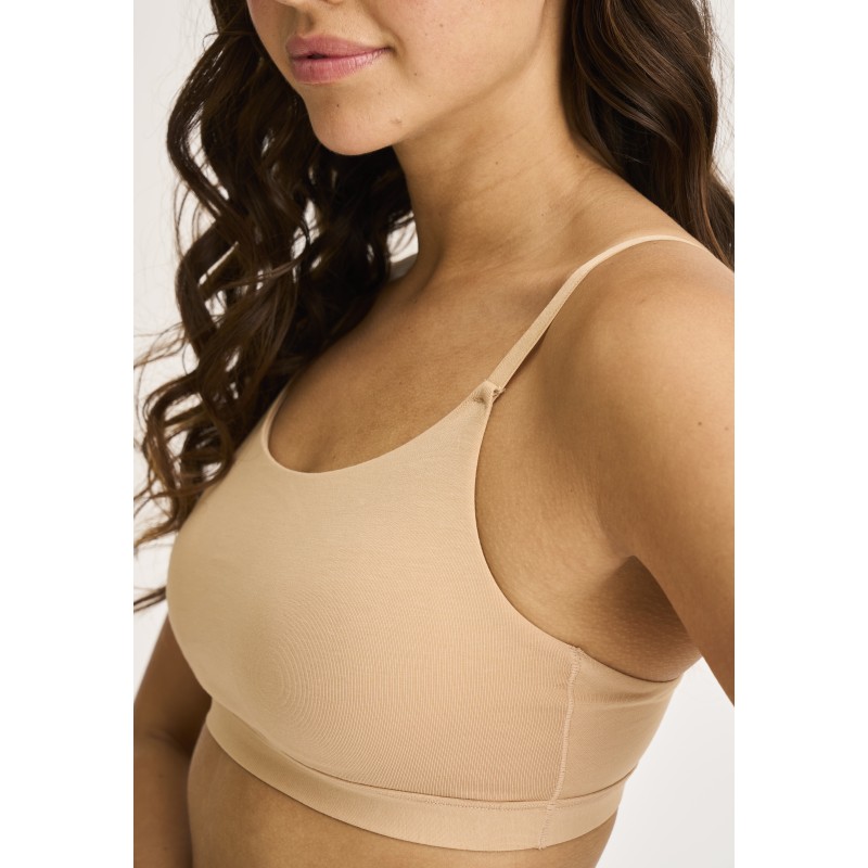 Den brede elastikkant under brystet sikrer, at modellen bliver siddende stabilt hele dagen og giver en behagelig, let støtte. De diskrete, fastlimede puder former brystet og giver et naturligt løft uden at virke fyldige. Fordi puderne er limet fast, bliver de siddende præcis, hvor de skal – også efter mange vaske – og de krøller eller folder ikke sammen i brug.