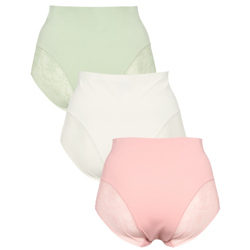 Trusserne har en høj talje med blondekant langs ben udskæringerne, hvilket får dine ben til at syne længere. Microfibre materialet ligger sig flot ind til kroppen og gør dem næsten usynlige under tøjet. Seamless maxi er pakket med tre par trusser.