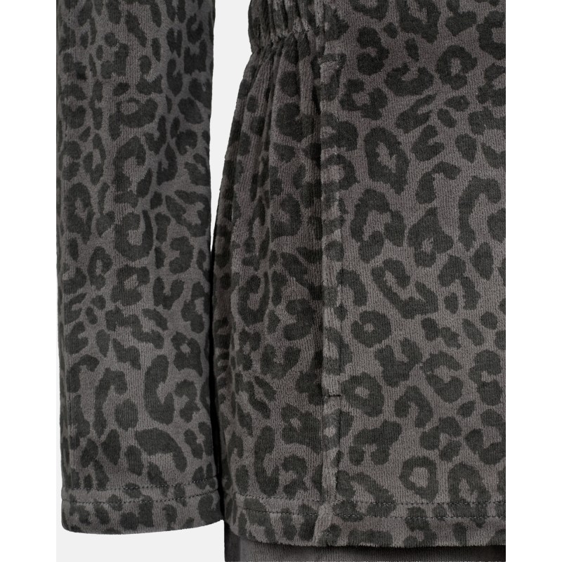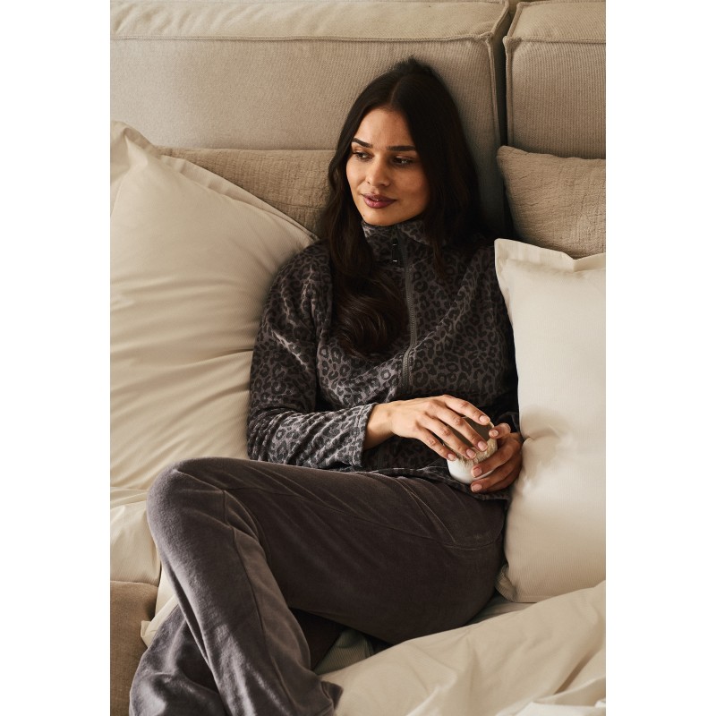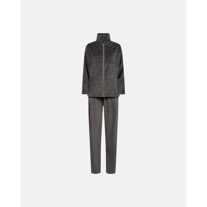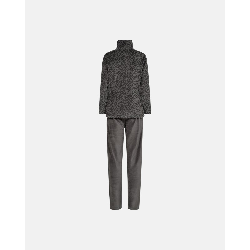 Buksen er ensfarvet og har elastik i taljen og trøjen er i i leopard i tone i tone som buksen. Trøjen bliver lukket med lynlås.