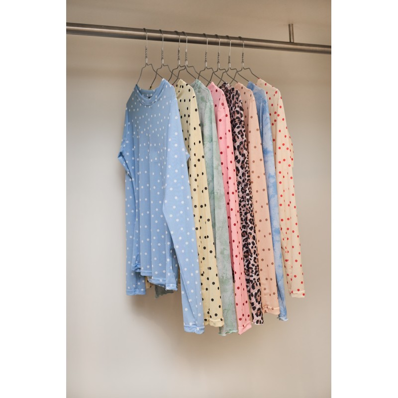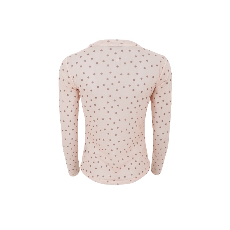 Lang ærmet mesh bluse med rund hals fra Black Colour. Blusen er rosa med beige prikker.