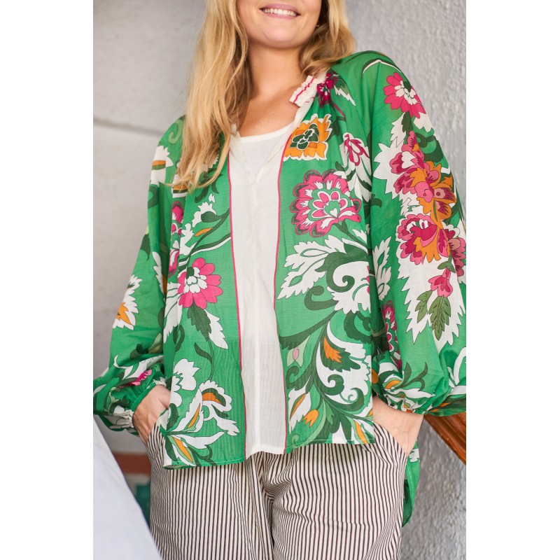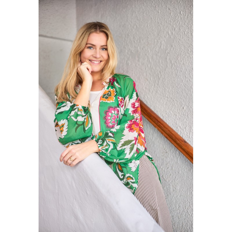 Flot printet bluse. Blusen har en løs og luftig pasform med lange ærmer og let volumen, som skaber et elegant og afslappet udtryk. Den fine V-udskæring kombineret med en dekorativ halskant tilfører et raffineret touch, mens kontrastdetaljen langs fronten giver et moderne twist. Den lette kvalitet gør blusen behagelig at have på – perfekt til både hverdag og særlige anledninger.
