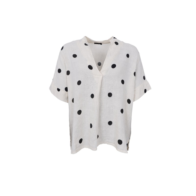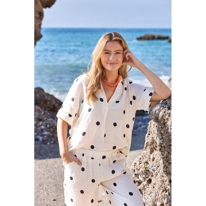 Denne flotte bluse er lavet i 100% hør, hvilket gør den super lækker og åndbar at have på. Blusen har korte ærmer, små sideslidser og en feminin v-hals, der giver et fint udtryk. Style blusen med matchende hørbukser eller et par stilfulde shorts.