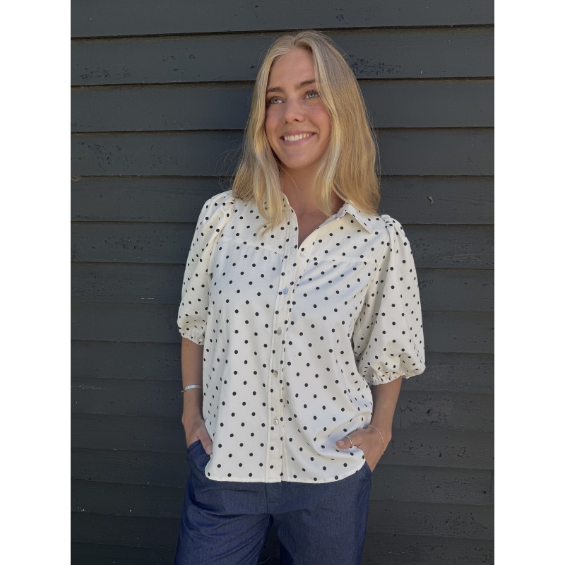 Alicia er en feminin bluse med sorte prikker – en tidløs kombination med et moderne twist.