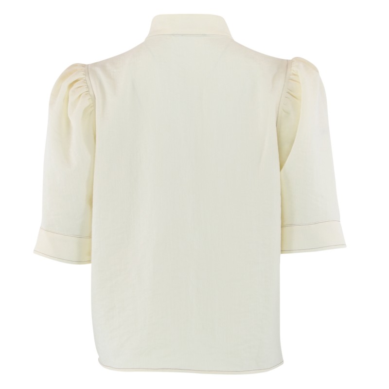 Moe er en let og feminin bluse med korte ærmer. Blusen er off white med en diskret sort syning.