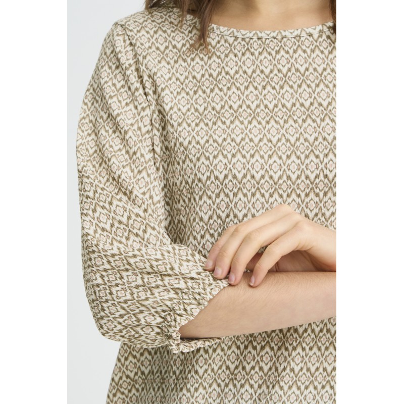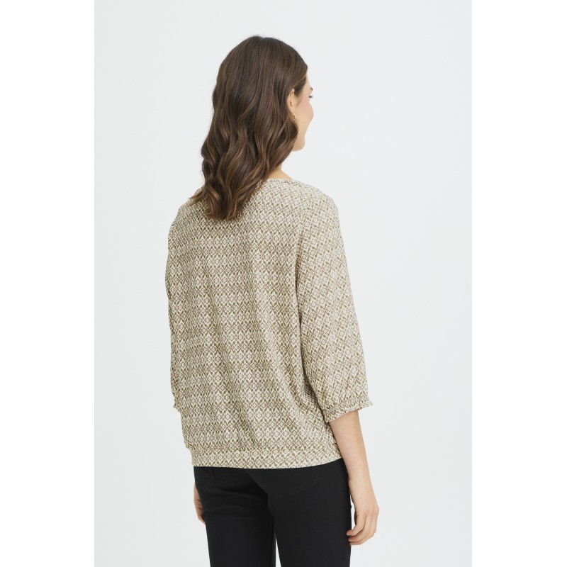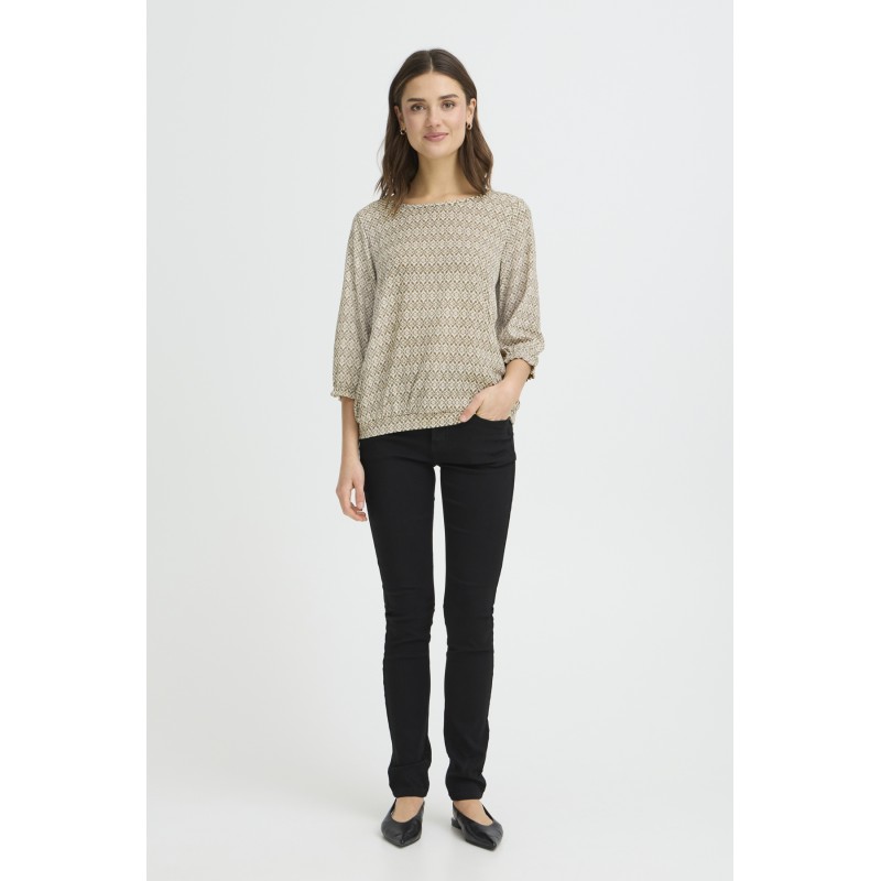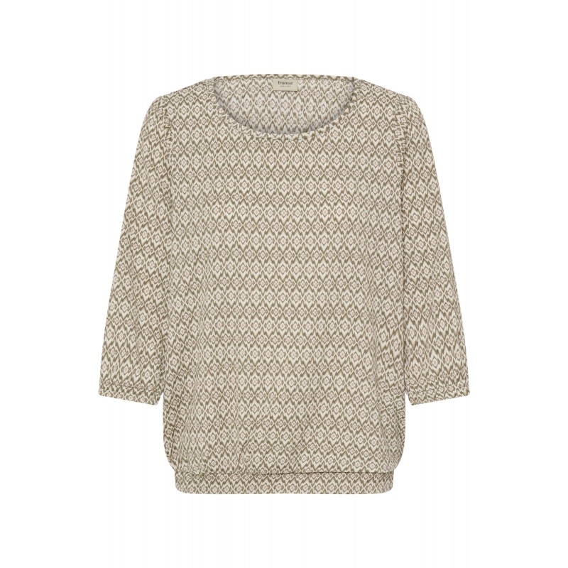 FRSLOANA tee er en printet bluse med rund hals og 3/4 lange ærmer. Blusen er lavet i en struktureret kvalitet og har elastik afslutning på ærmerne og en rib forneden.