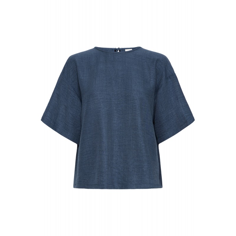 IHKATICO SH er en bluse med blødt, vævet look og bred pasform. Blusen har en rund halsudskæring, sænkede skuldre og korte, vide ærmer giver et moderne udtryk. Blusen har en åben ryg som bliver bundet med 3 bindebånd.