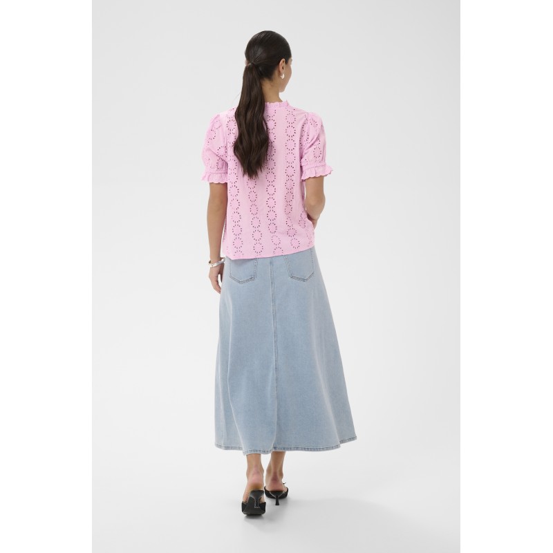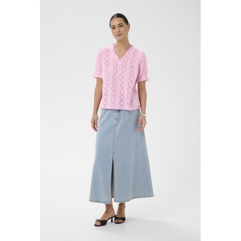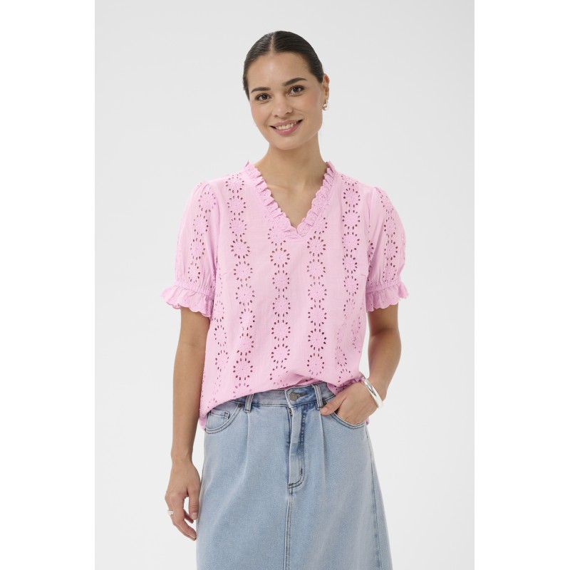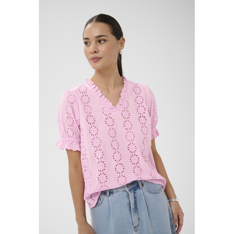 Sød bluse med kort ærmer og v-udskæring, der er dekoreret med fine flæse kanter. KAdona blusen har lige pasform og lodrette rækker af gennemgående broderi hul mønster.