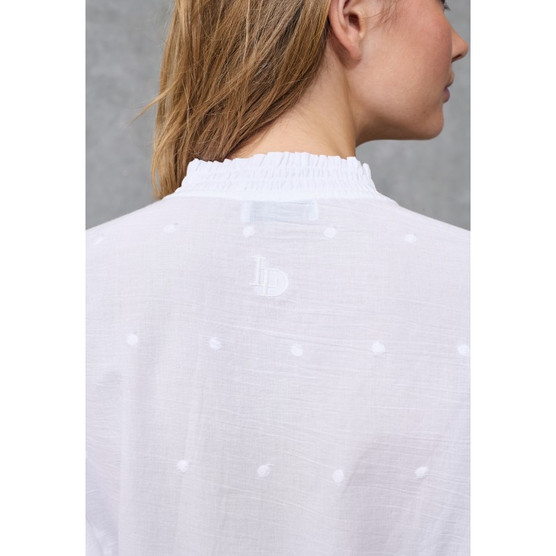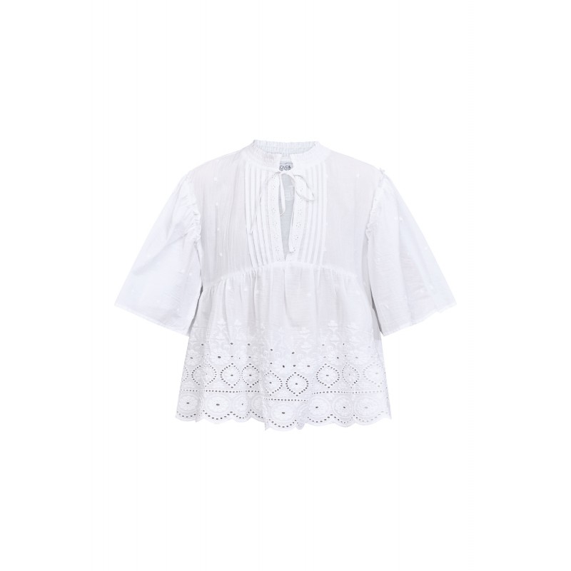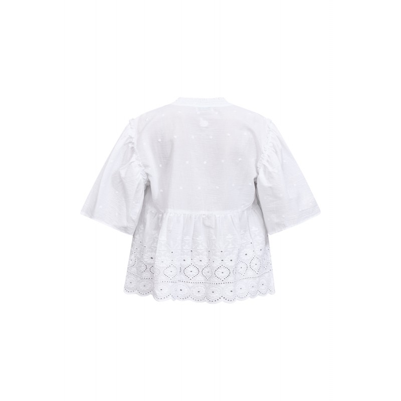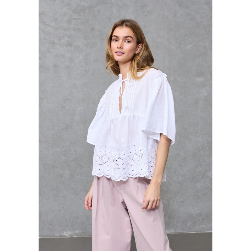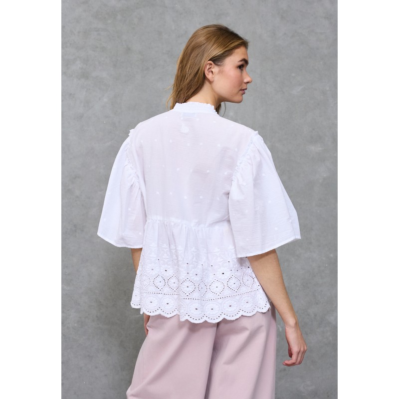 Smuk og feminin boheme-bluse fra Love&Divine med smukke broderie anglaise-detaljer og en romantisk peplum-silhuet. Blusen har pufærmer, en elegant bindelukning i halsen og fine læg.