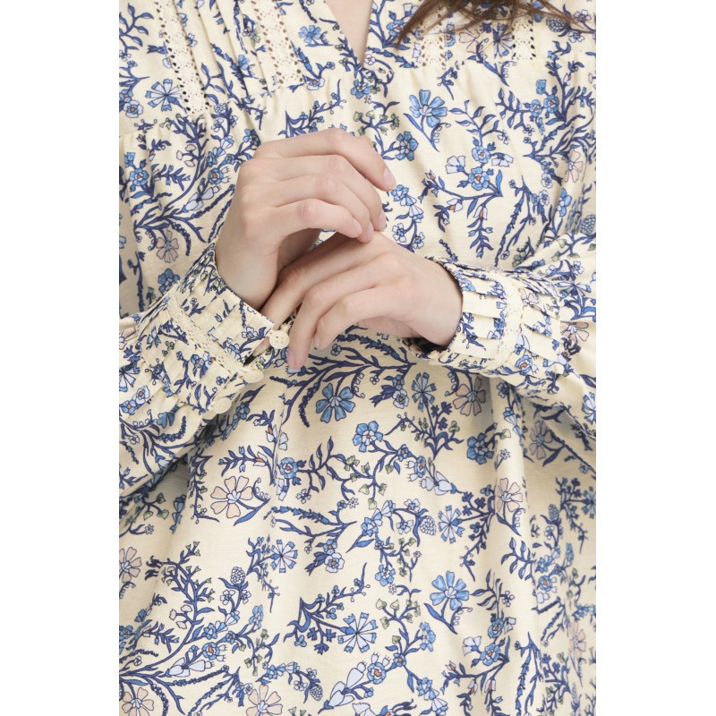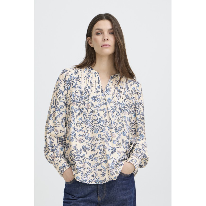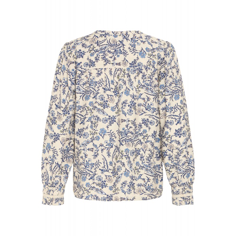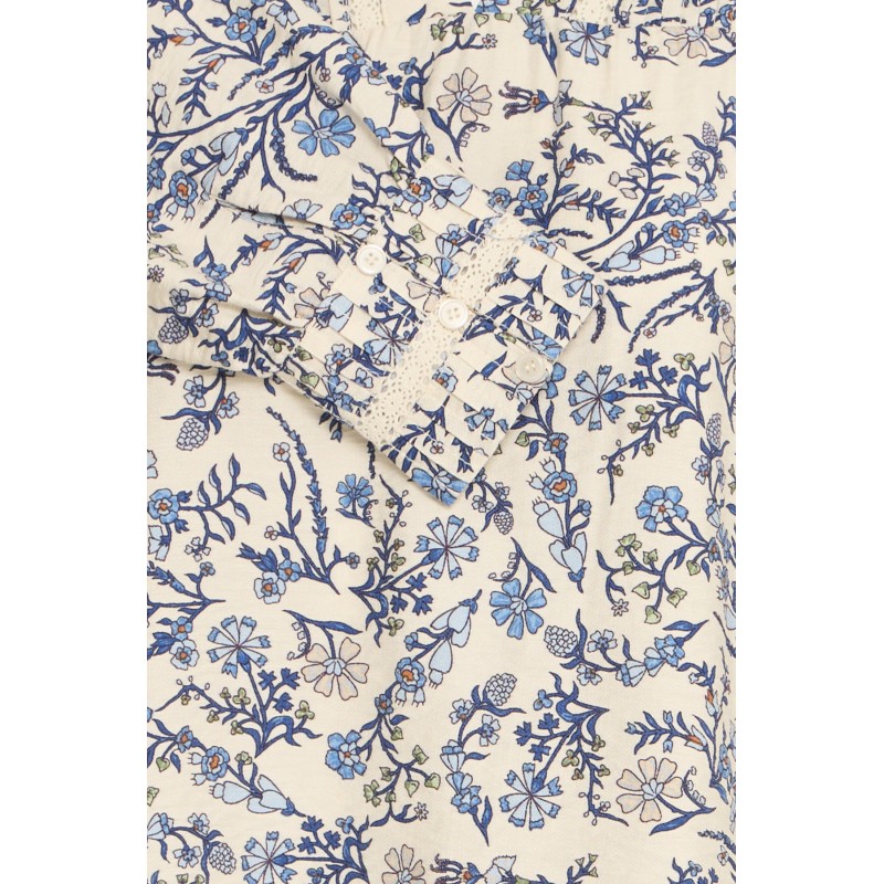 PZBRINA er en feminin bluse fra Pulz med blå blomster. Blusen er langærmet og har fine broderede detaljer foroven og på ærmerne.