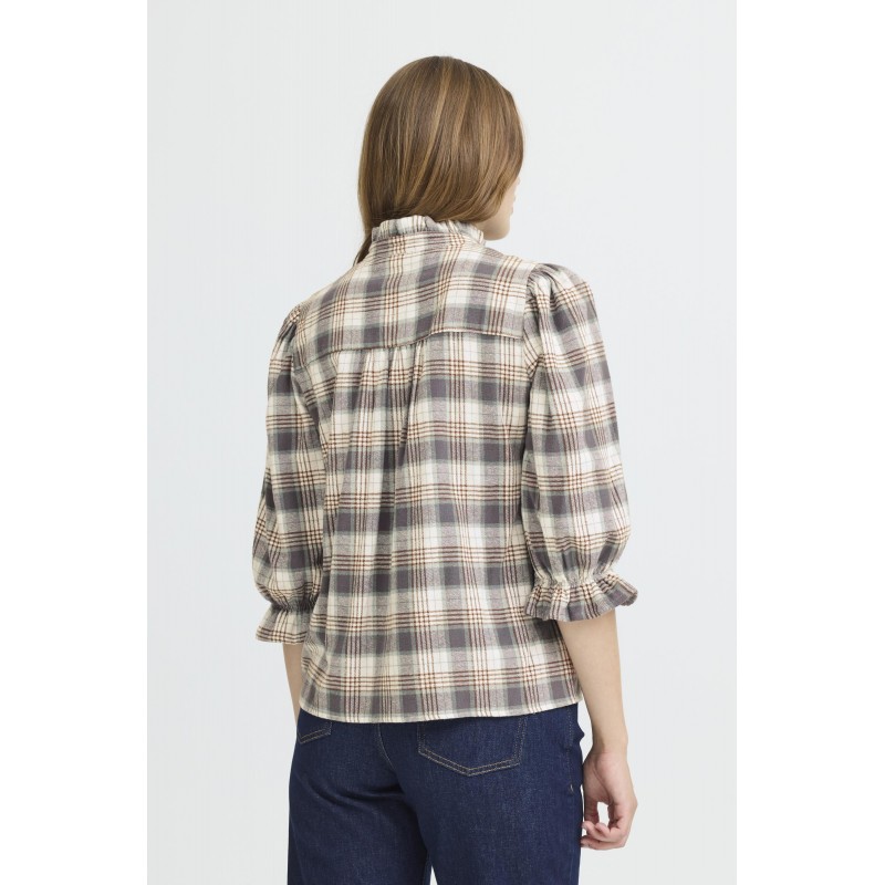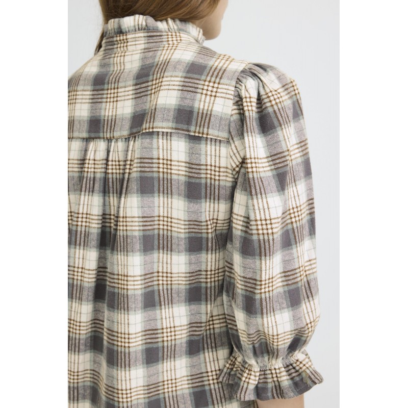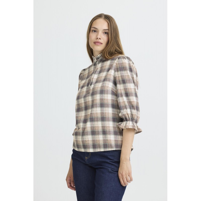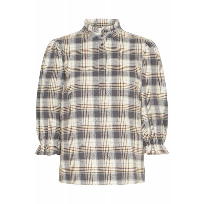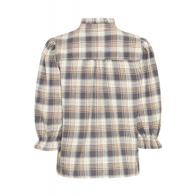 Smart ternet bluse i bomuldsflonel. PZEVIE blusen er med høj hals og flæsekant, 3/4 ærmer der afsluttes med en elastik og flæsekant. Den har stolpelukning foran og en syning over ryggen.