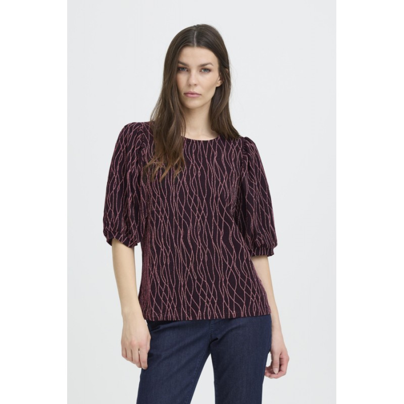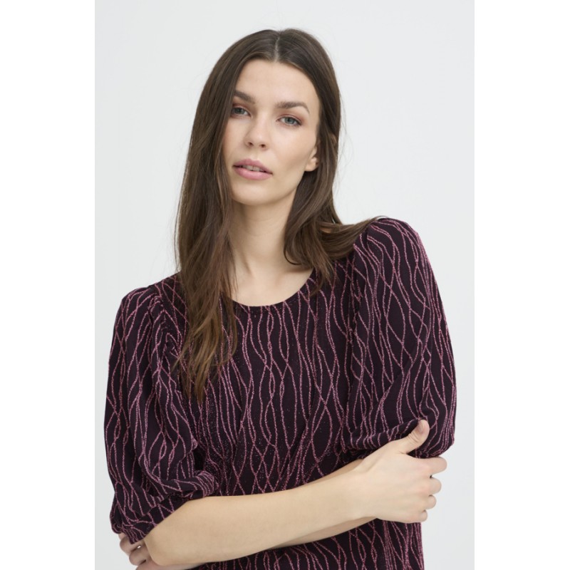 Flot bluse fra Pulz med rosa lurex glimmer mønster. PZTHEA blusen har en sød og feminin pasform med rund hals og korte ærmer i en god længde ned til albuen.
