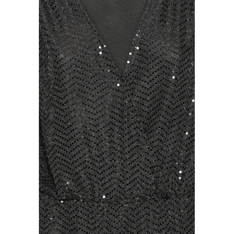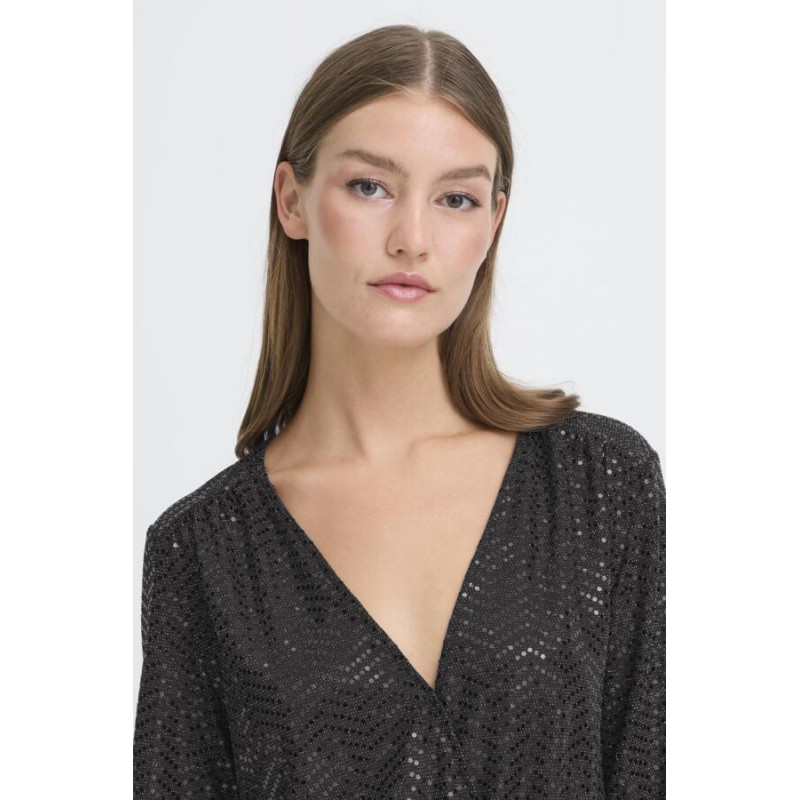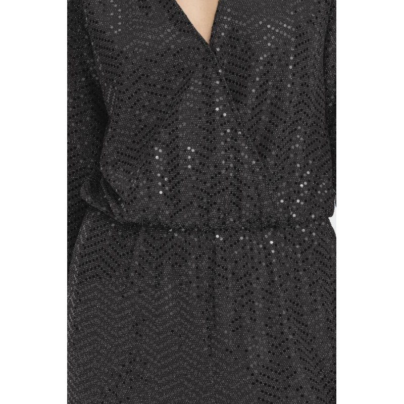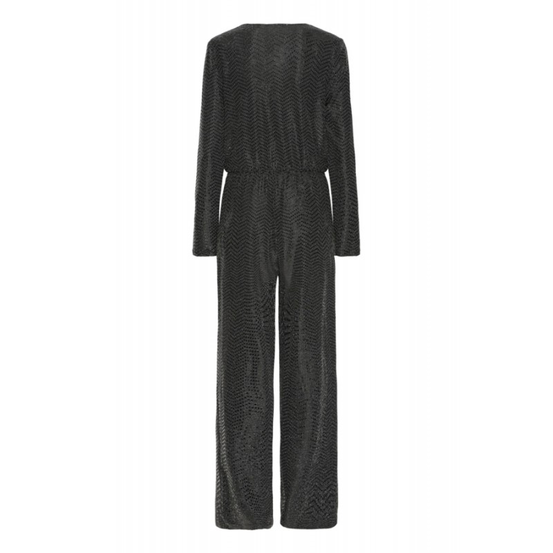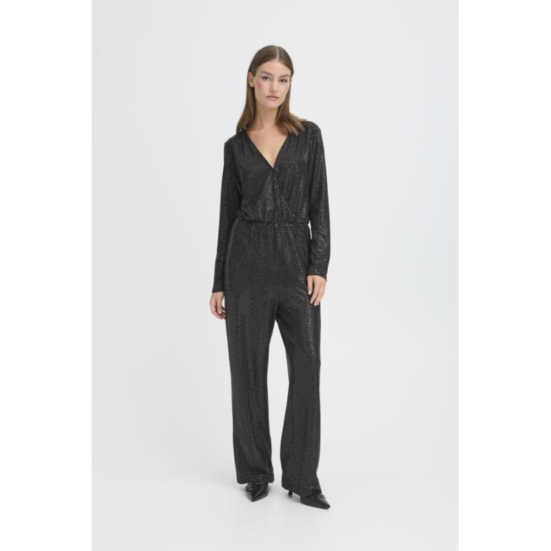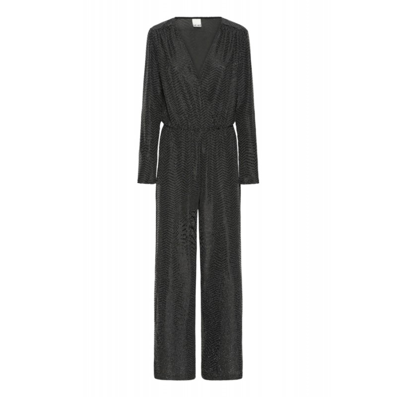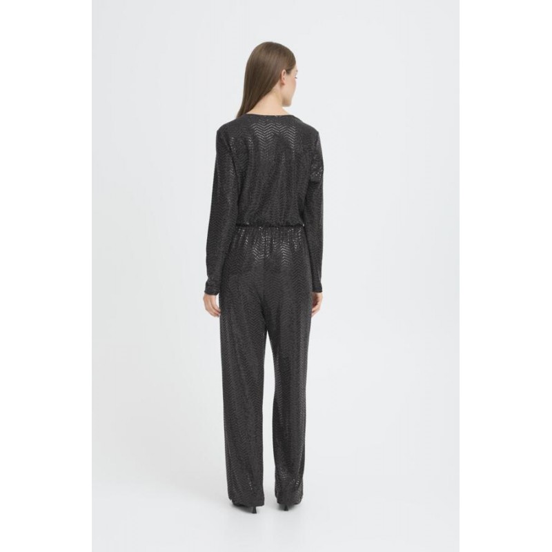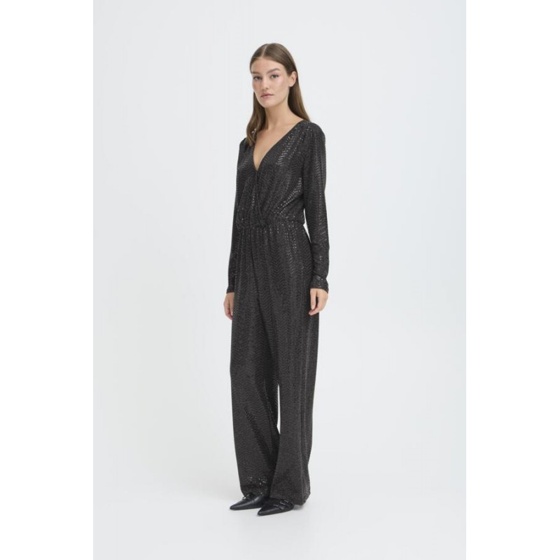 Smart sort buksedragt fra ICHI med glimmer og pallietter. IHNELINIA buksedragten har en dyb v-udskæring og slå-om effekt. Den har lange ærmer, elastik i taljen og vidde i benene.