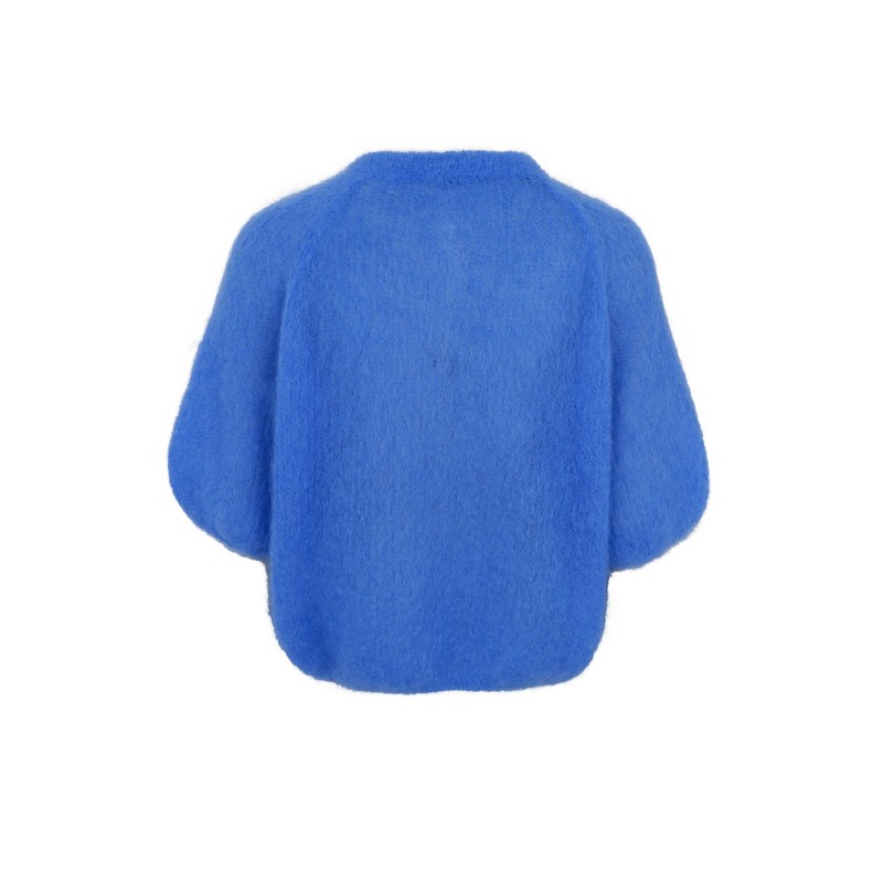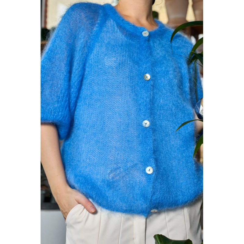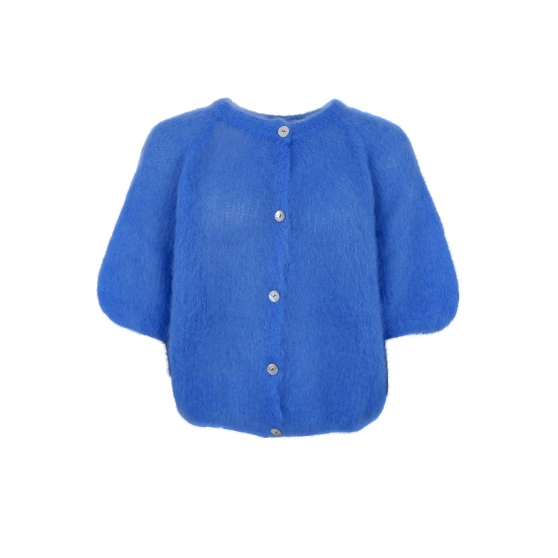 Bjoerk cardiganen fra Black Colour er strikket i en let og fluffy kvalitet, der giver et eksklusivt og feminint udtryk. Modellen har rund hals og korte, puffede ærmer, som skaber en moderne og afslappet silhuet. Cardiganen lukkes foran med fine knapper, der understreger det enkle og elegante design.