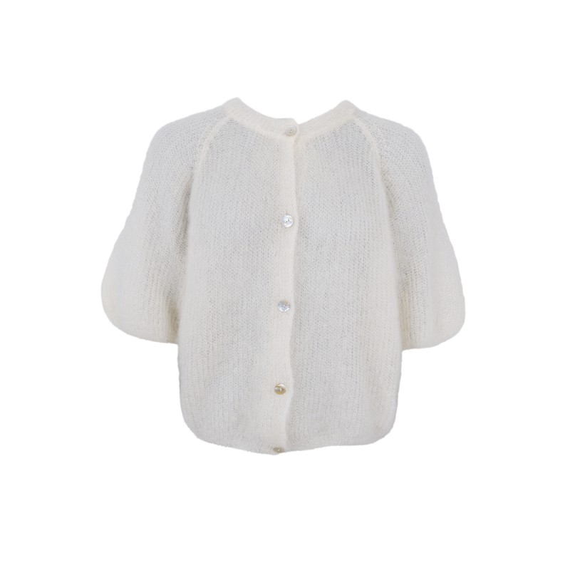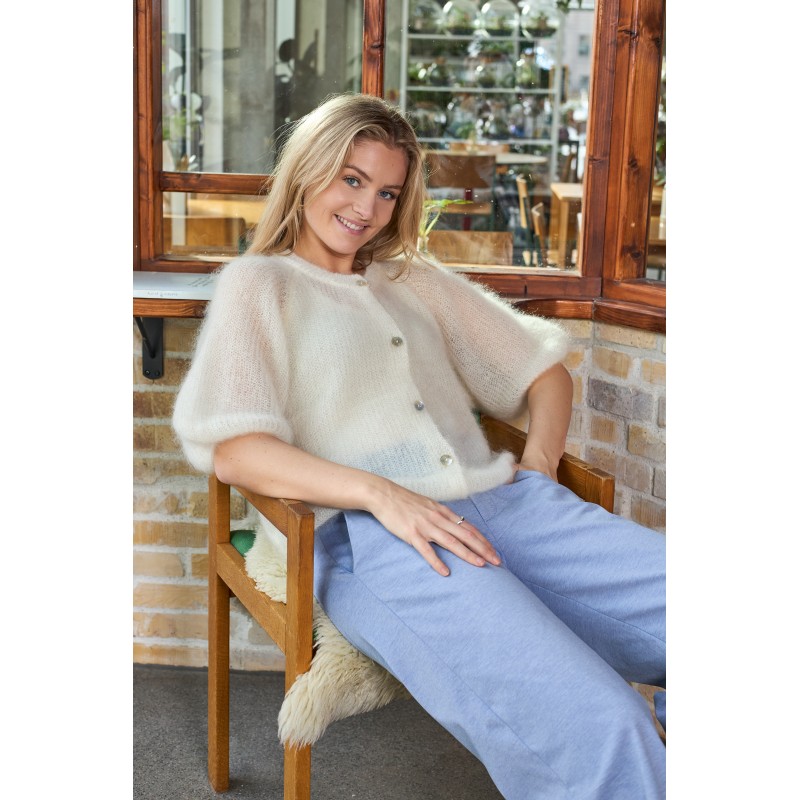 Bjoerk cardiganen fra Black Colour er strikket i en let og fluffy kvalitet, der giver et eksklusivt og feminint udtryk. Modellen har rund hals og korte, puffede ærmer, som skaber en moderne og afslappet silhuet. Cardiganen lukkes foran med fine knapper, der understreger det enkle og elegante design.