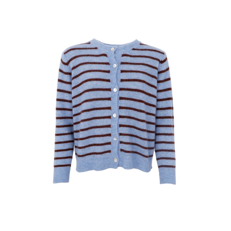 Fin strikcardigan lavet i en skøn uldblanding, i en flot blå farve med brune striber. BCDELL cardiganen har rundhals, lange ærmer og er gennemknappet.