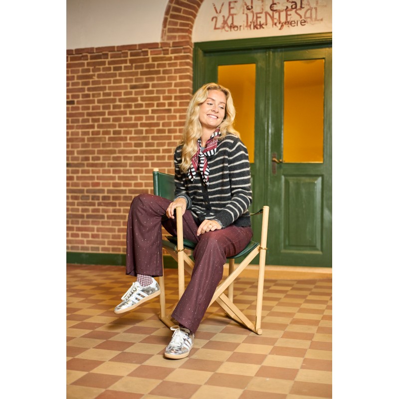 Fin strikcardigan lavet i en skøn uldblanding, i en flot brun farve med lyse striber. BCDELL cardiganen har rundhals, lange ærmer og er gennemknappet.
