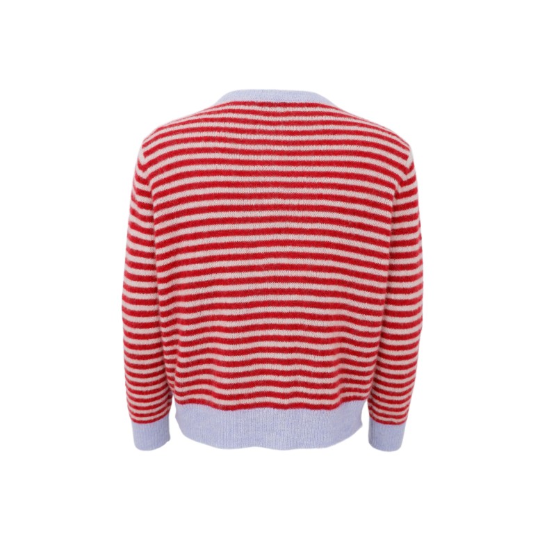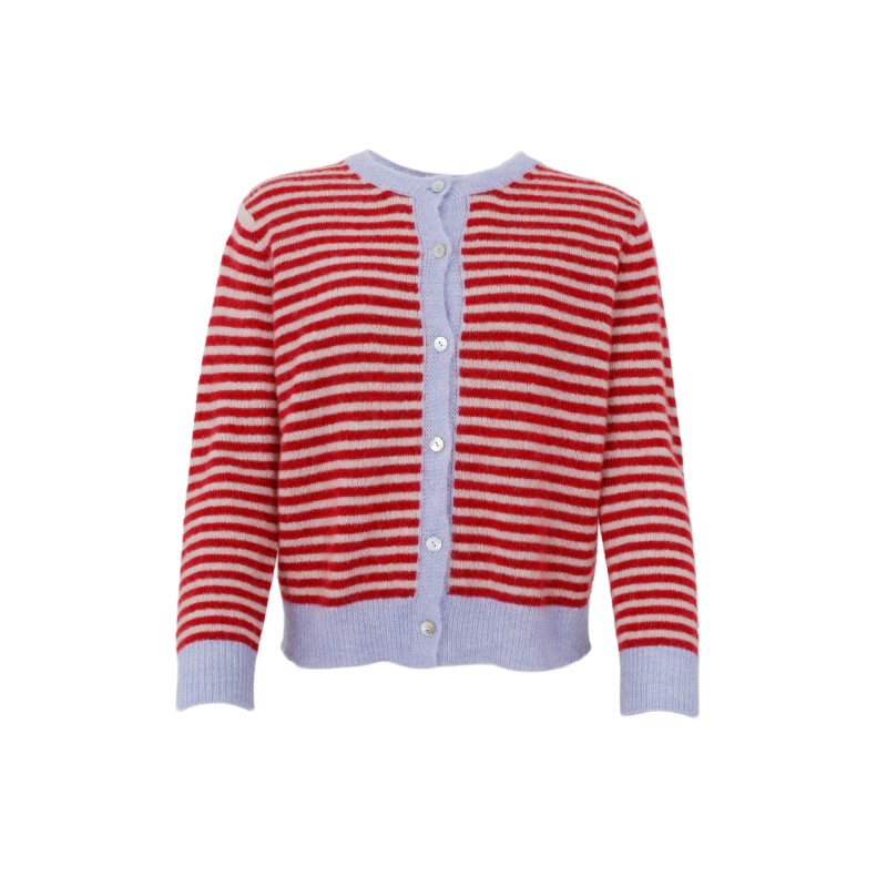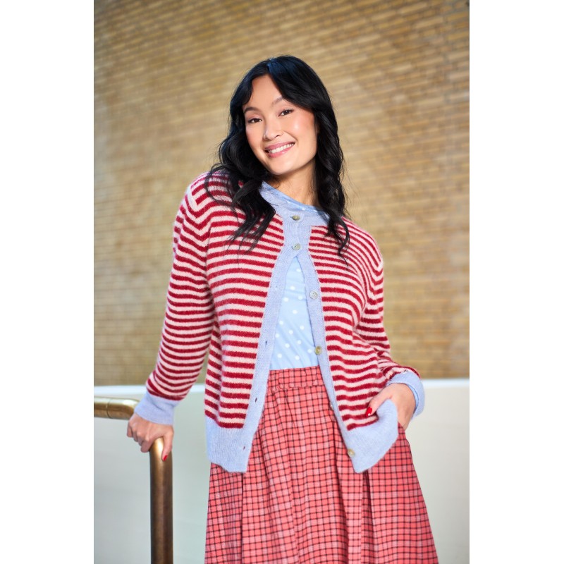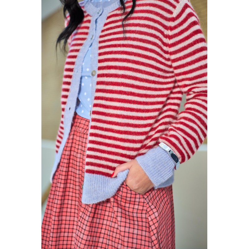 Fin strikcardigan lavet i en skøn uldblanding, i en flot Rød med lyseblå striber. BCDELL cardiganen har rundhals, lange ærmer og er gennemknappet.