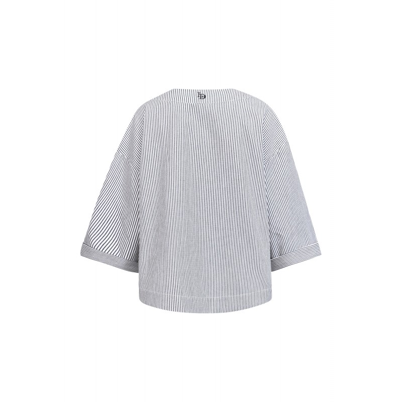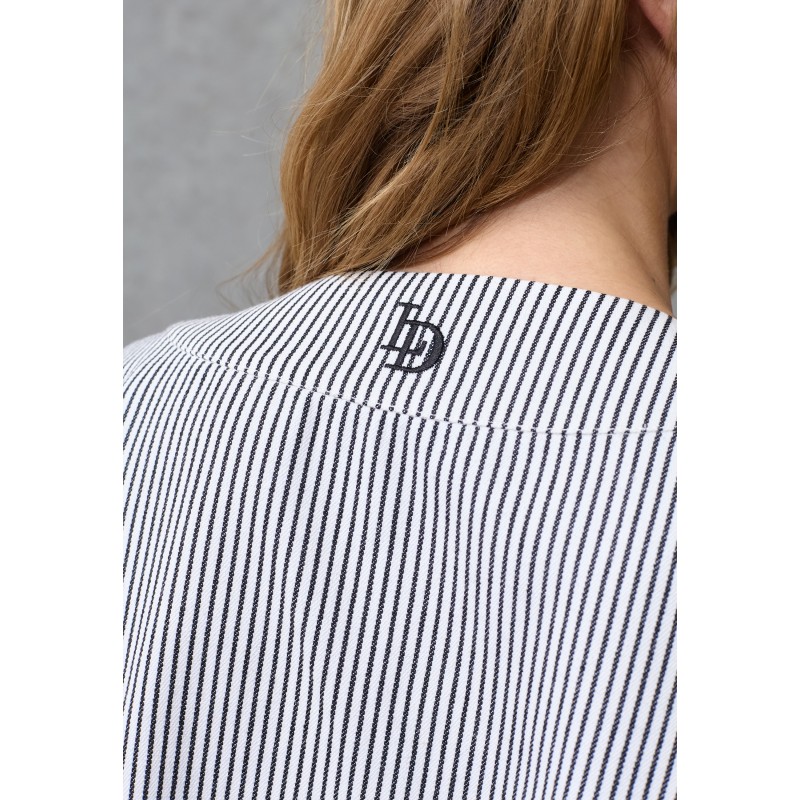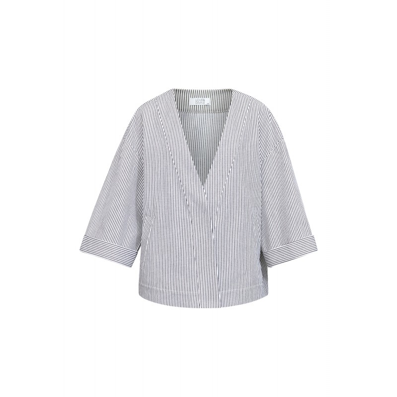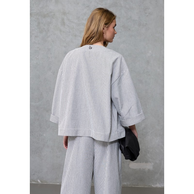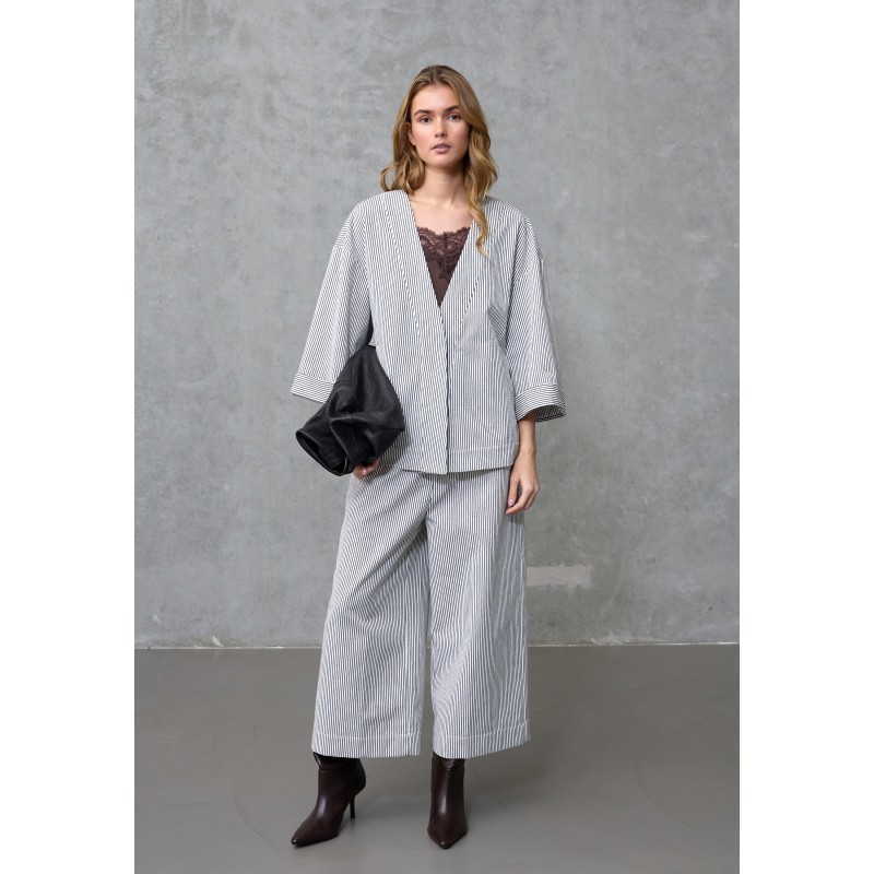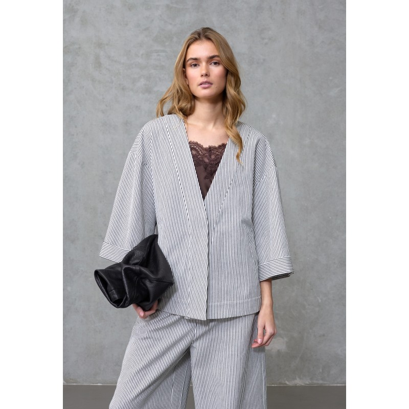 Kort Cardigan/Jakke fra Love & Divine i let kvalitet med fine, smalle striber. Cardiganen har V-udskæring og en løstsiddende pasform med korte ærmer med vidde. Perfekt både til hverdag og pænere brug.