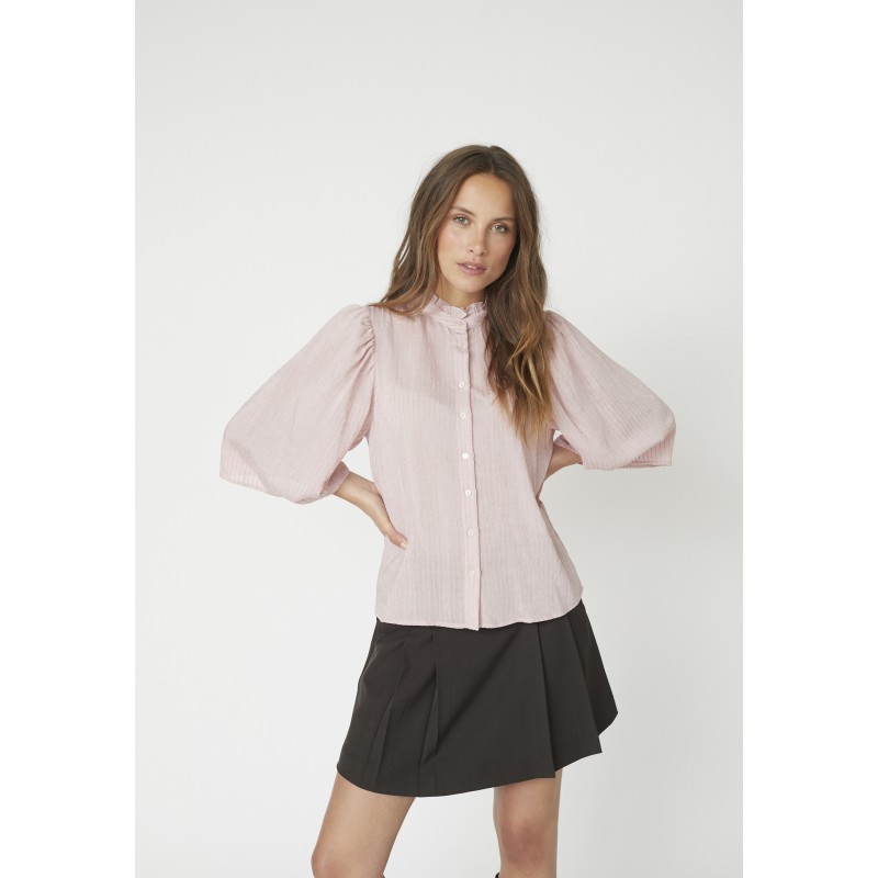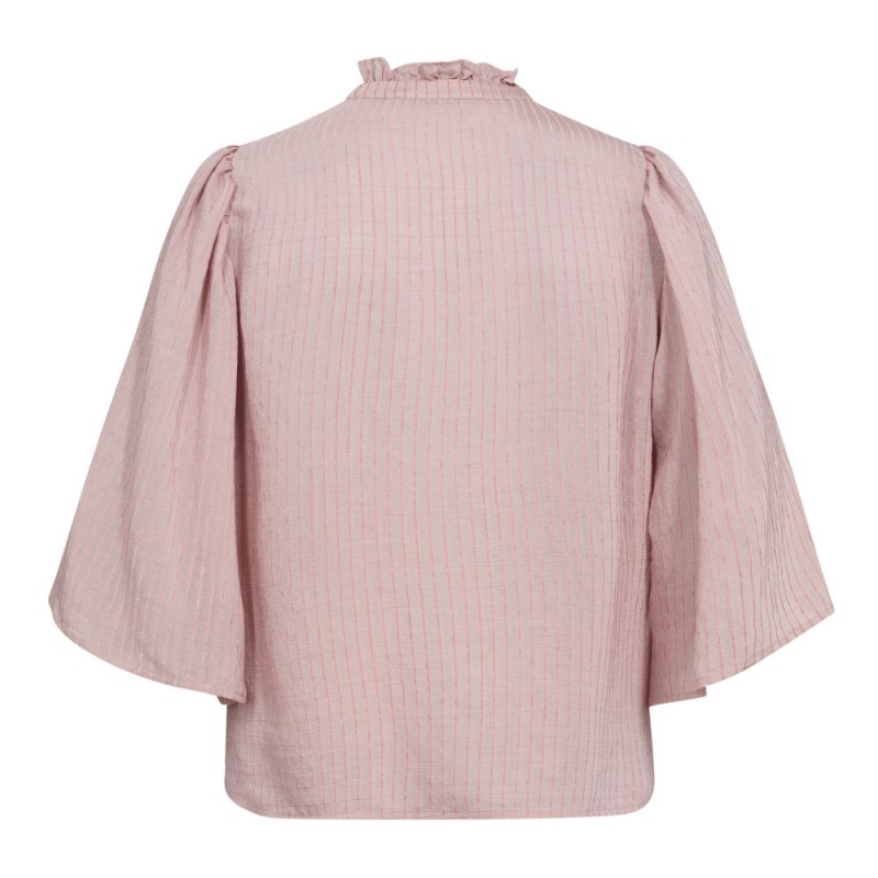 Fin og feminin lyserød skjorte, med en pink stribe. Viola skjorten har store 3/4 lange vinge ærmer, er gennemknappet foran og har en sød høj hals med flæser.