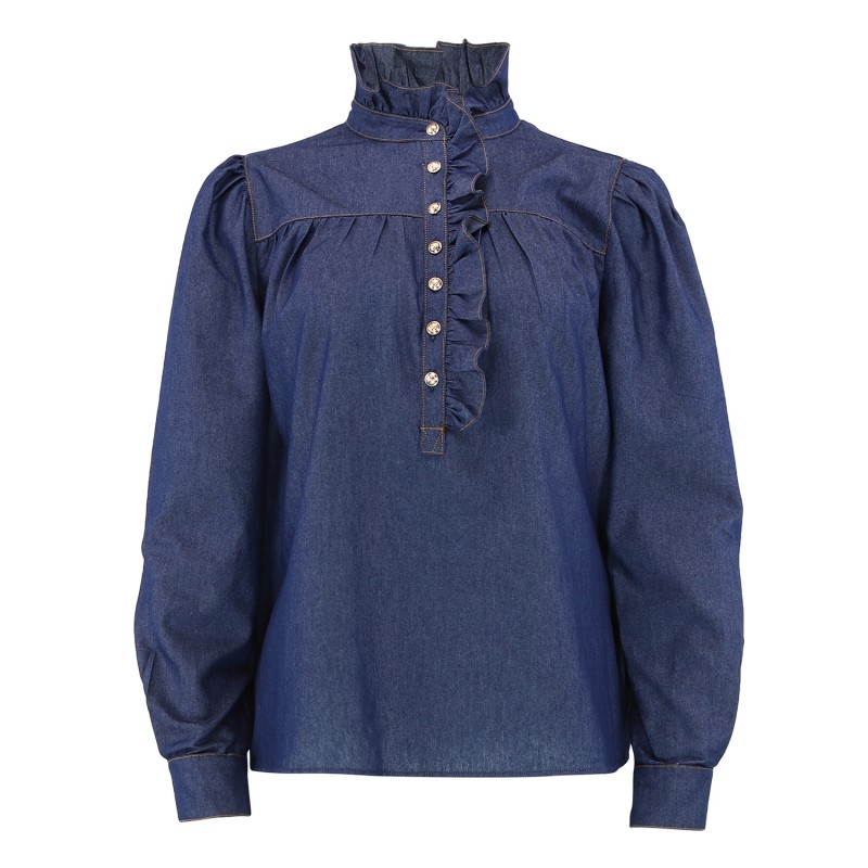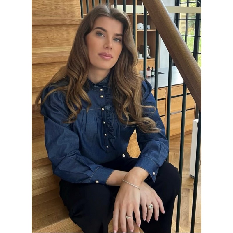 Smuk blå skjorte i chambre fra CONTINUE. Ariana skjorte har en lille flæse krave og stolpelukning med de fineste knapper. Skjorten har lange ærmer med et lille puf.