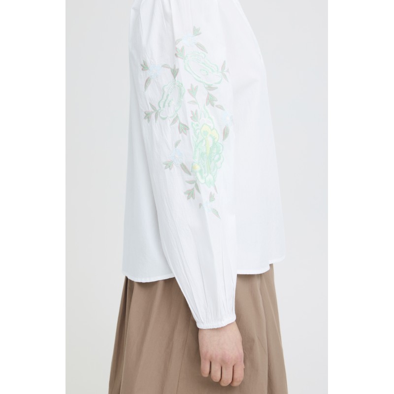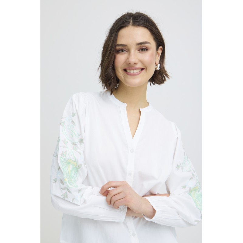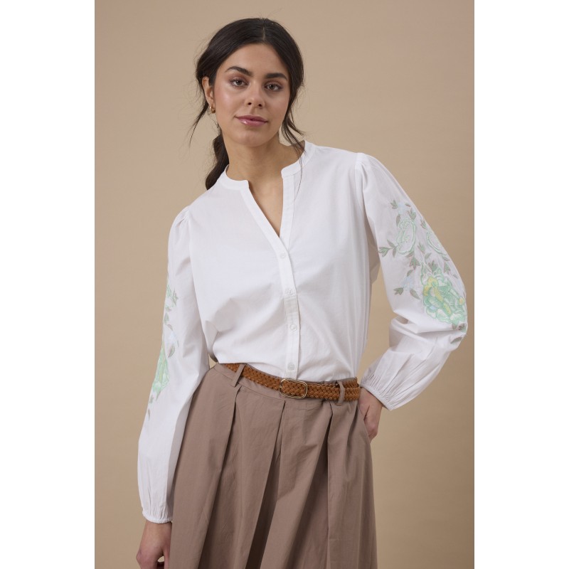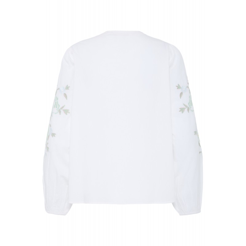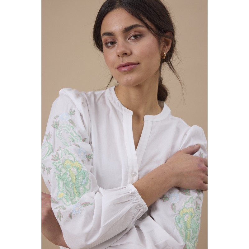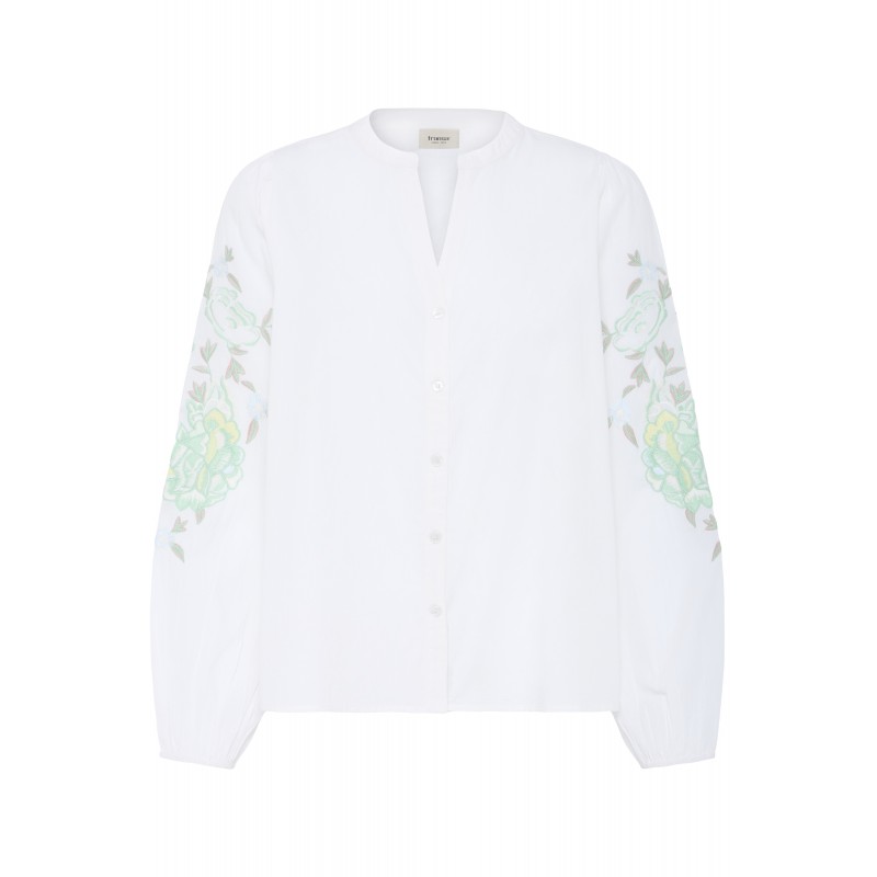 Hvid skjorte med fint grønt broderi på ærmerne. FROLANA skjorten er med kinakrave der går ned i en V-udskæring, gennemknappet og har lange ærmer med elastik nederest.