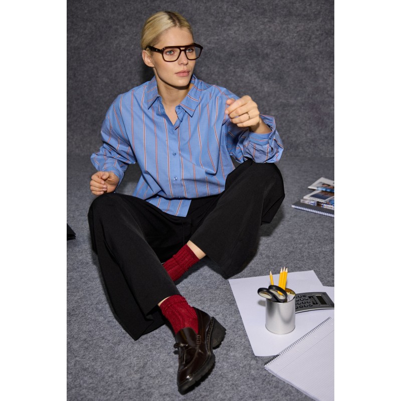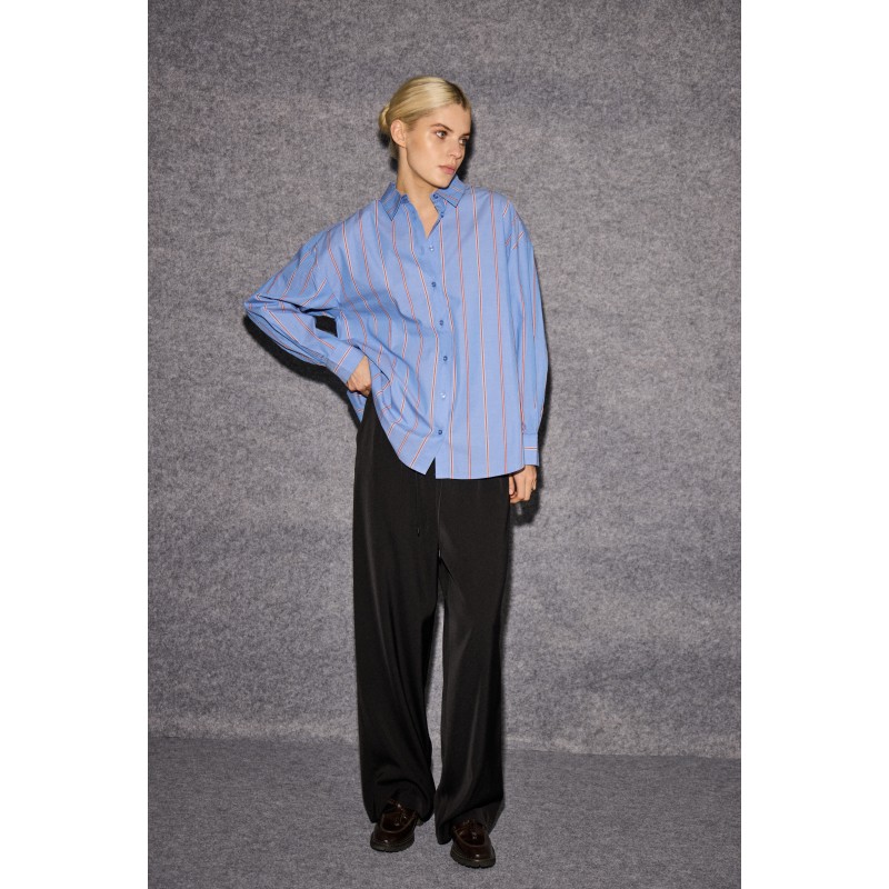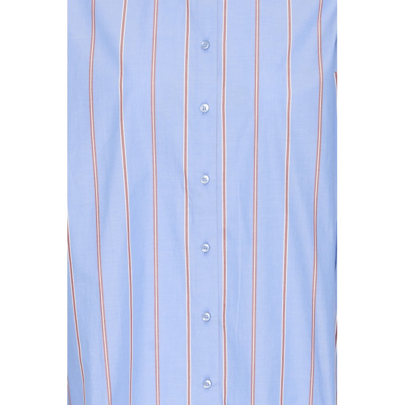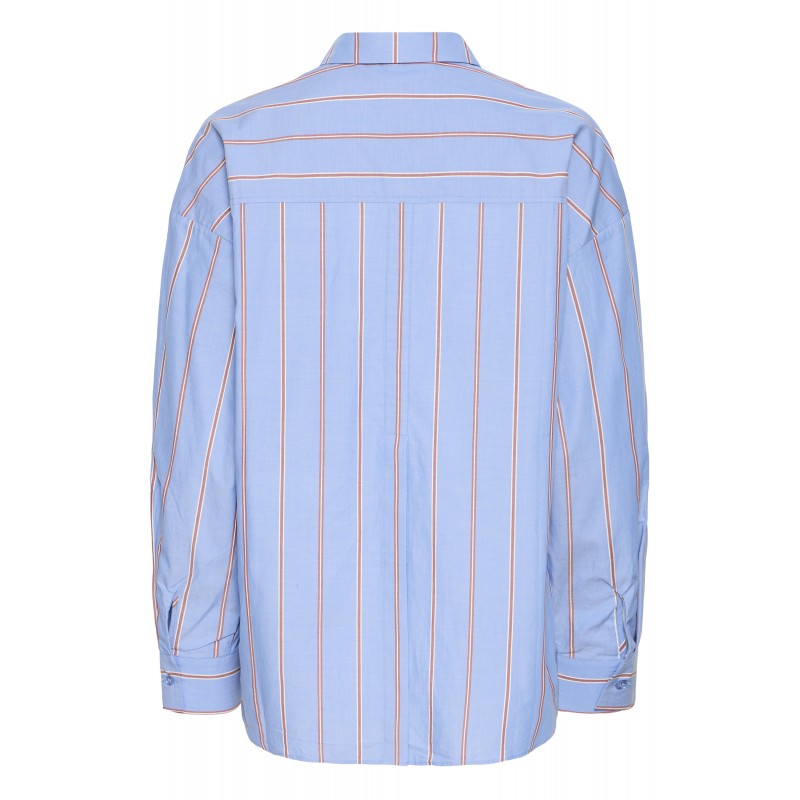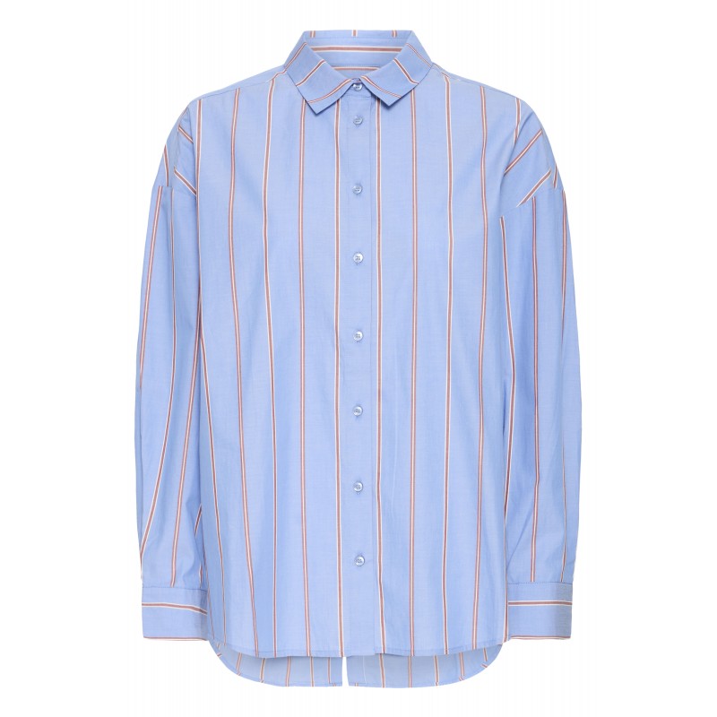 Smart oversize skjorte i lyseblå med korale striber. IHSADIA skjorten er længere bagtil end foran og har en fed detalje med en lang slids bagpå. Den har almindelige skjortekrave, er gennemknappet og har lange ærmer med manchet.