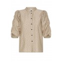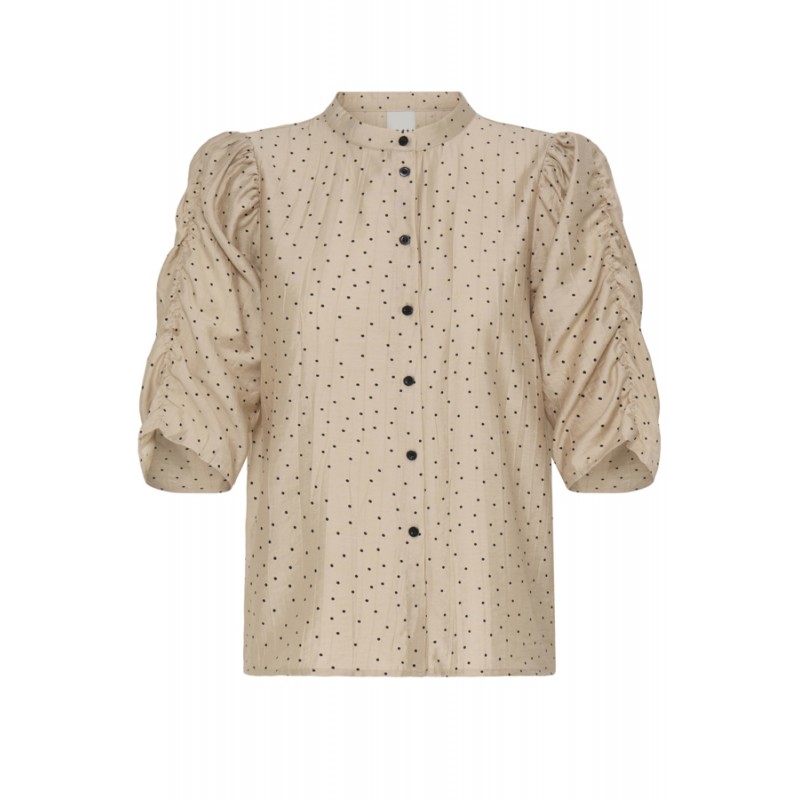 Smart skjorte fra ICHI i en smuk beige farve med sorte prikker. IHXCAROLINE skjorten har rund hals med kina krave og korte ærmer med en fin elastik detalje.