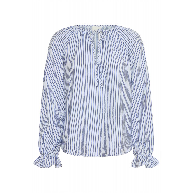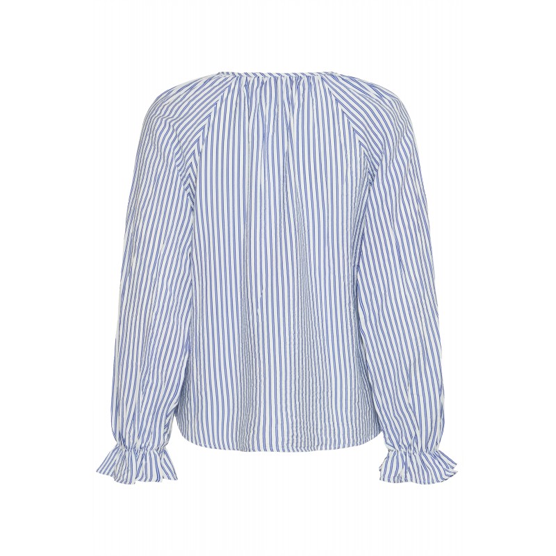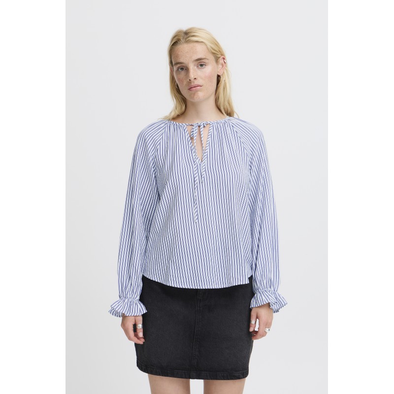 IXSHEILA er en blå stribet bluse fra Ichi i en skøn viskose blanding. Blusen har lange ærmer med en elastik og y-hals udskæring med et bindebånd.