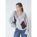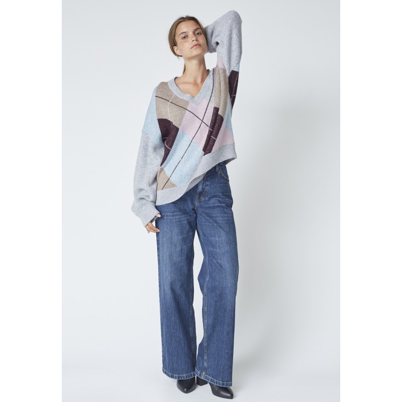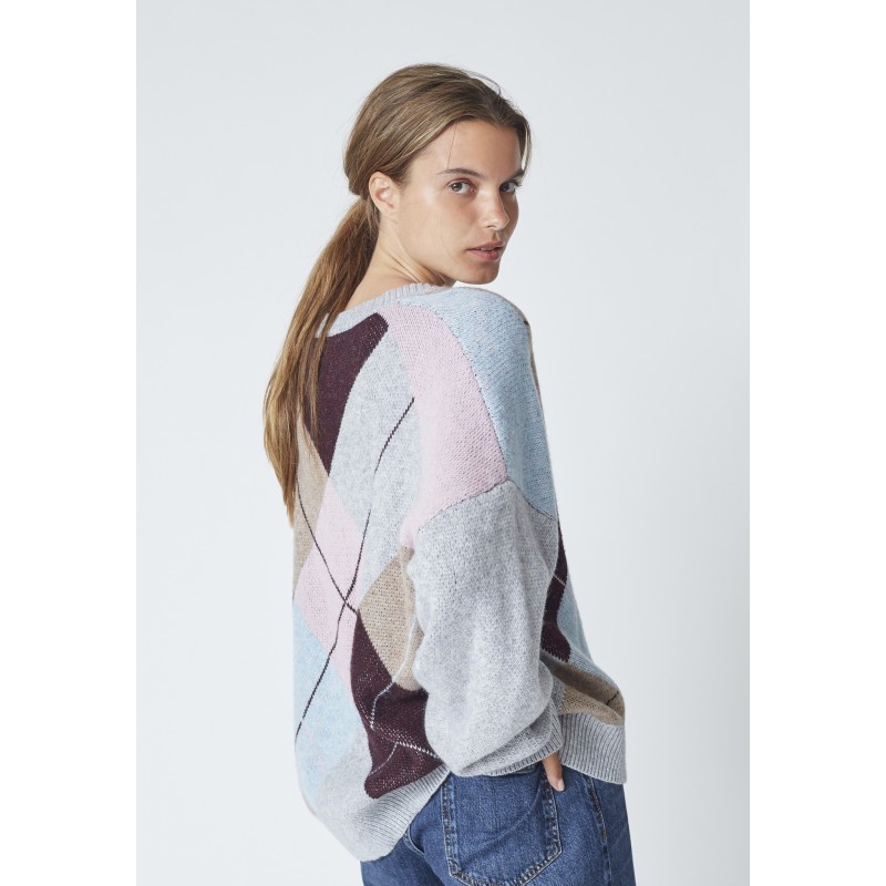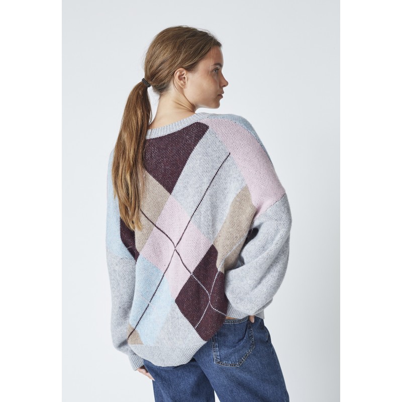 Smuk strik fra Co'couture i et flot harlekin ternet mønster i grå, lyseblå, pink, brun og maroon nuancer. MajaCC strikken er med V-udskæring, drop-down skuldre, lange ærmer og ribkant ved håndled, hals og talje.