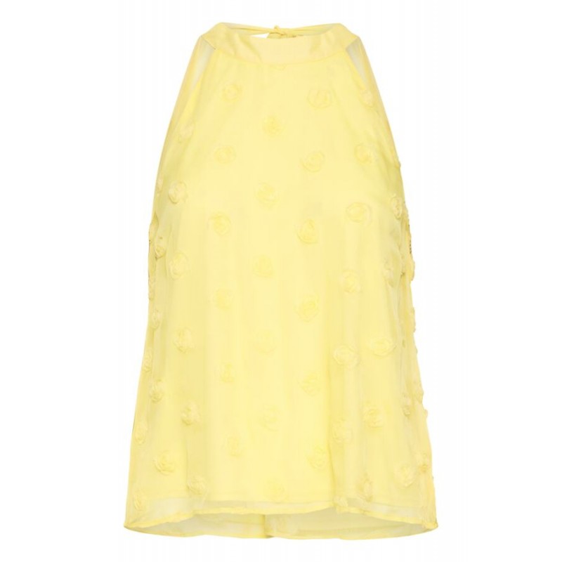 Sød top fra ICHI i chiffon med halterneck lukning. IHFLOMA toppen er lavet i en smuk chiffon med tone i tone print og har et fast foer. Den lukkes med en lille knap i nakken og har en smule a-shape.