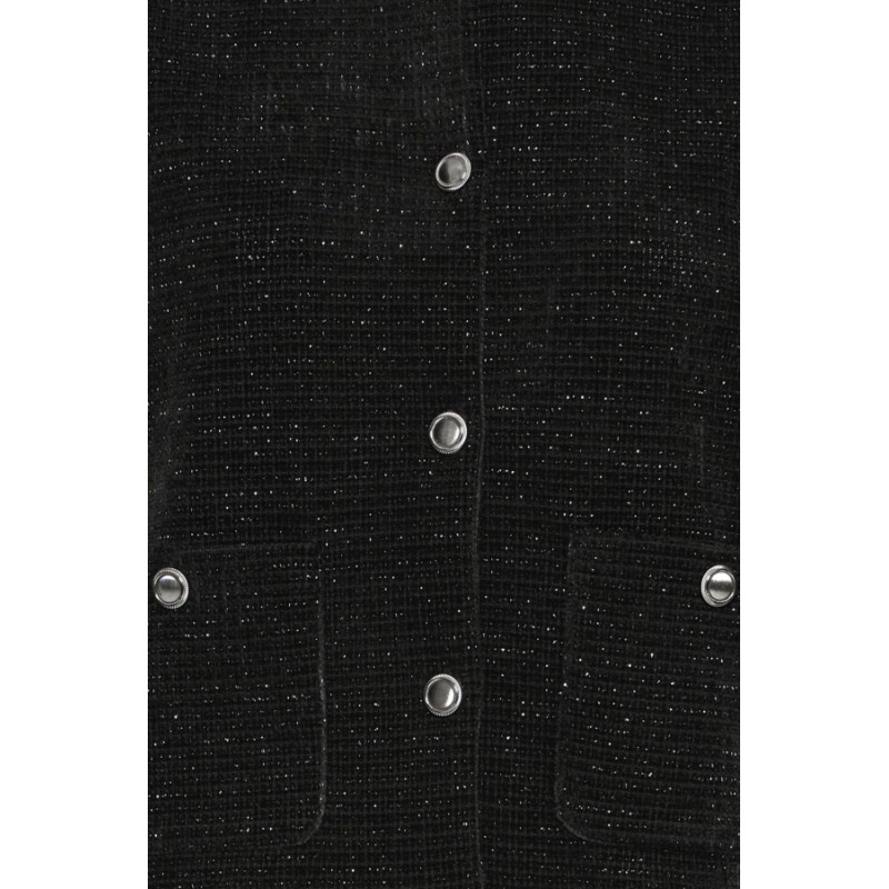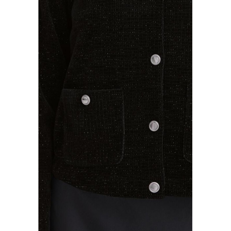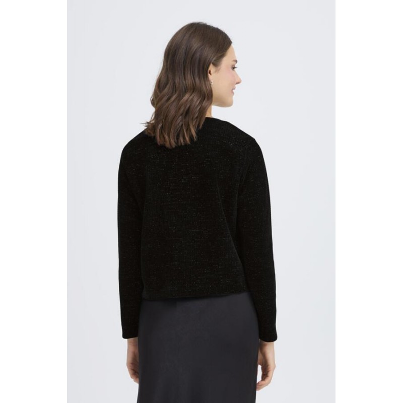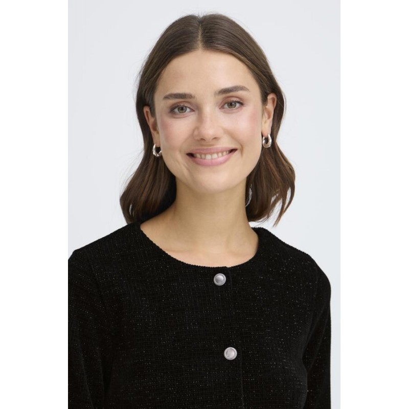 Smart kort jakke fra Fransa i en strikket kvalitet med lurex. FRMALAYA jakken har rund hals, er gennemknappet og har 2 små lommer foran. Jakken har en smart kort længde og kan både bruges lukket og åben.