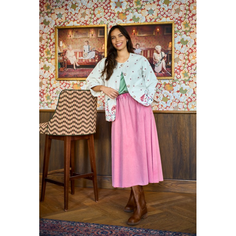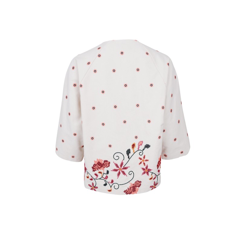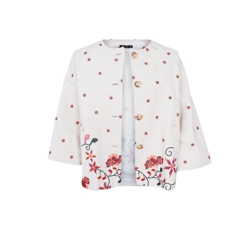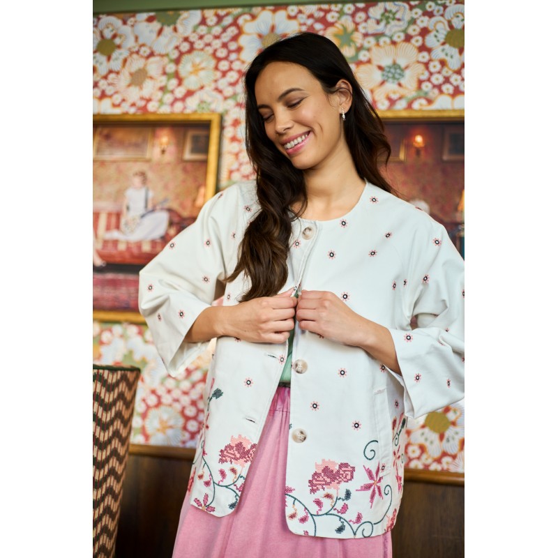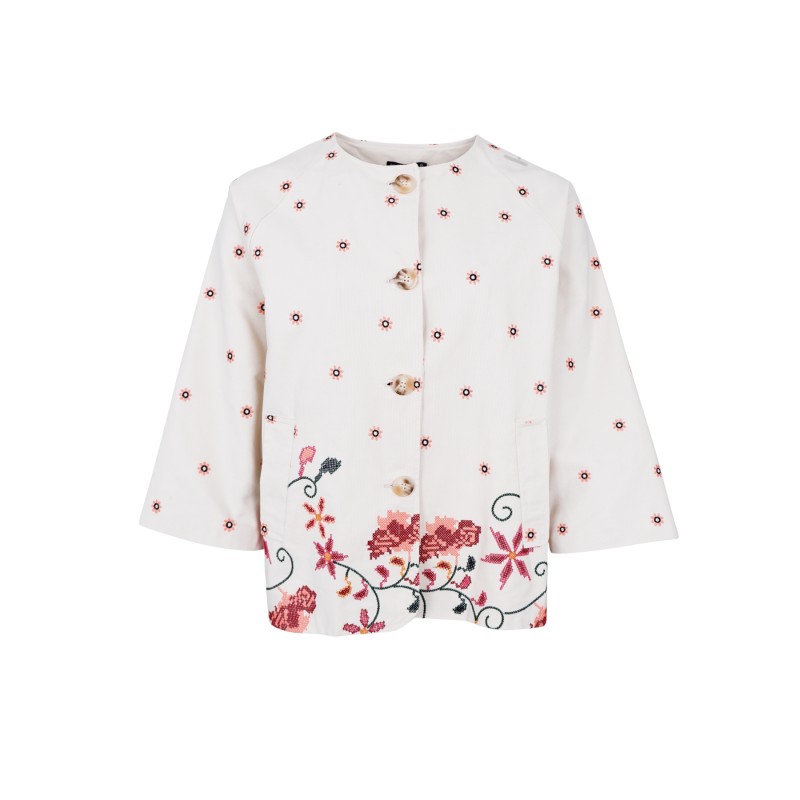 Designet med rund hals og knaplukning foran, som tilfører et klassisk og tidløst look. De korte, brede ærmer giver jakken et moderne twist, mens de fine detaljer skaber et unikt og dekorativt udtryk.