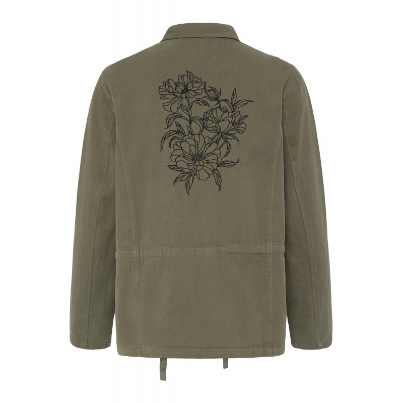 Flot jakke med sort blomsterbroderi bagpå. FRJULINE jakken er med lige pasform, men kan snørres ind i taljen. Jakken har skjult lynlås frontlukning, spids krave, skulderstropper og fire lommer med flap. Mat, struktureret overflade for et afslappet udtryk.
