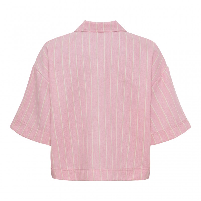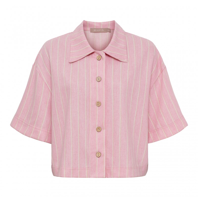 Let jakke fra Marta i en blød lyserød nuance med diskrete striber. MdcAbella jakken er designet med klassisk krave og gennemgående knaplukning, hvilket giver et stilrent og alsidigt look.