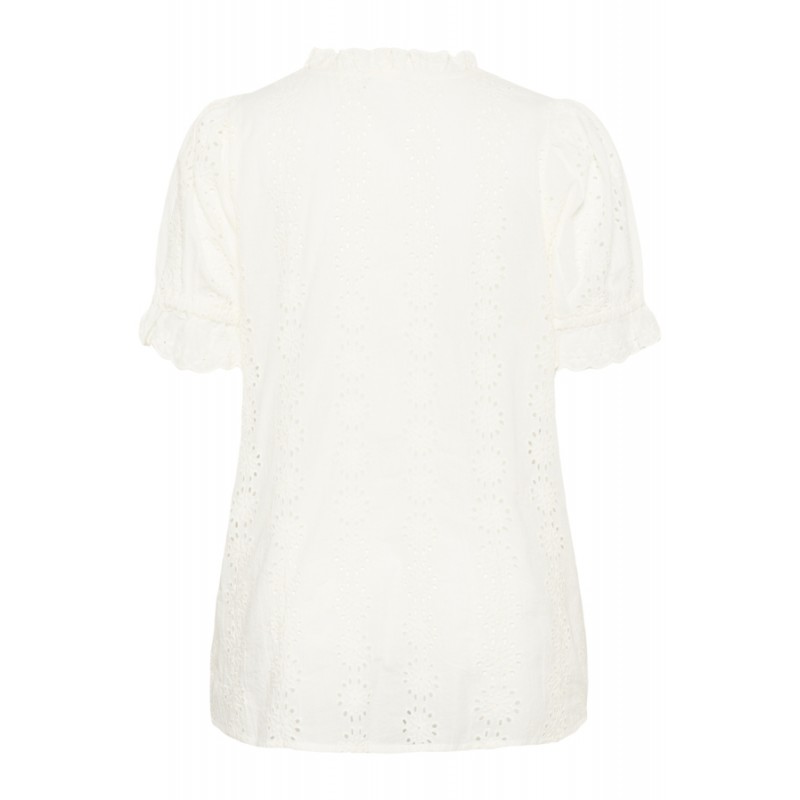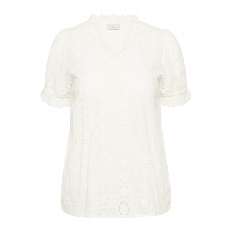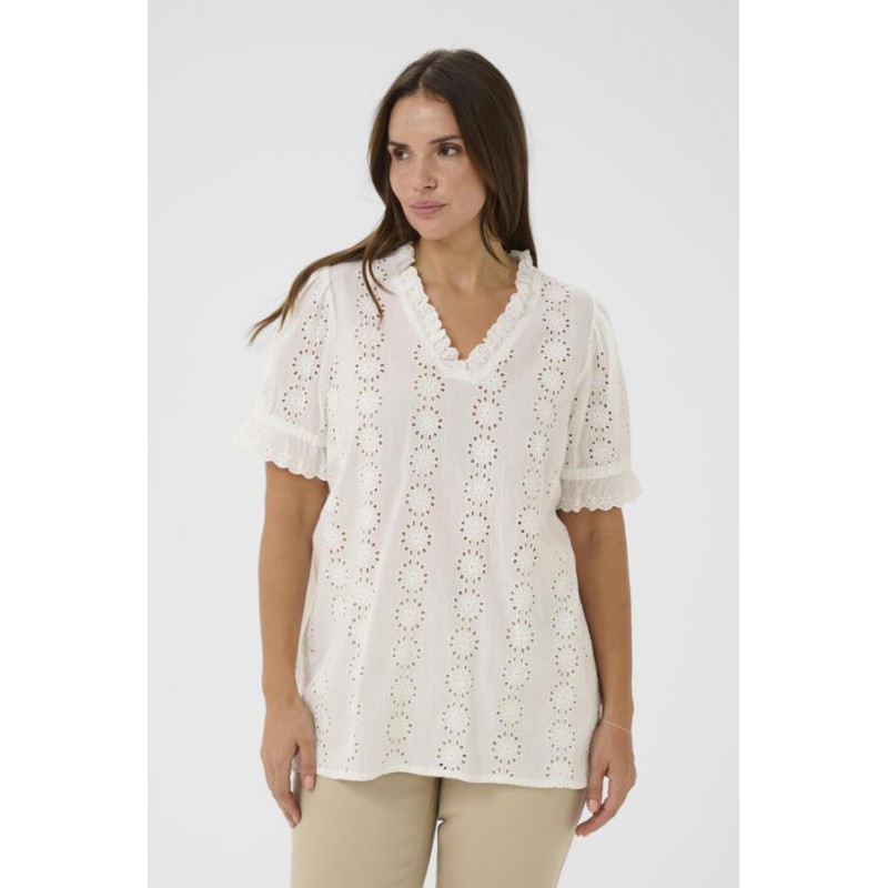 Sød kortærmet blonde bluse fra Kaffe Curve. KCdina blusen har v-hals og korte ærmer med en lille flæsekant. Blusen er lavet i en blød bomulds kvalitet med et sødt blonde mønster.