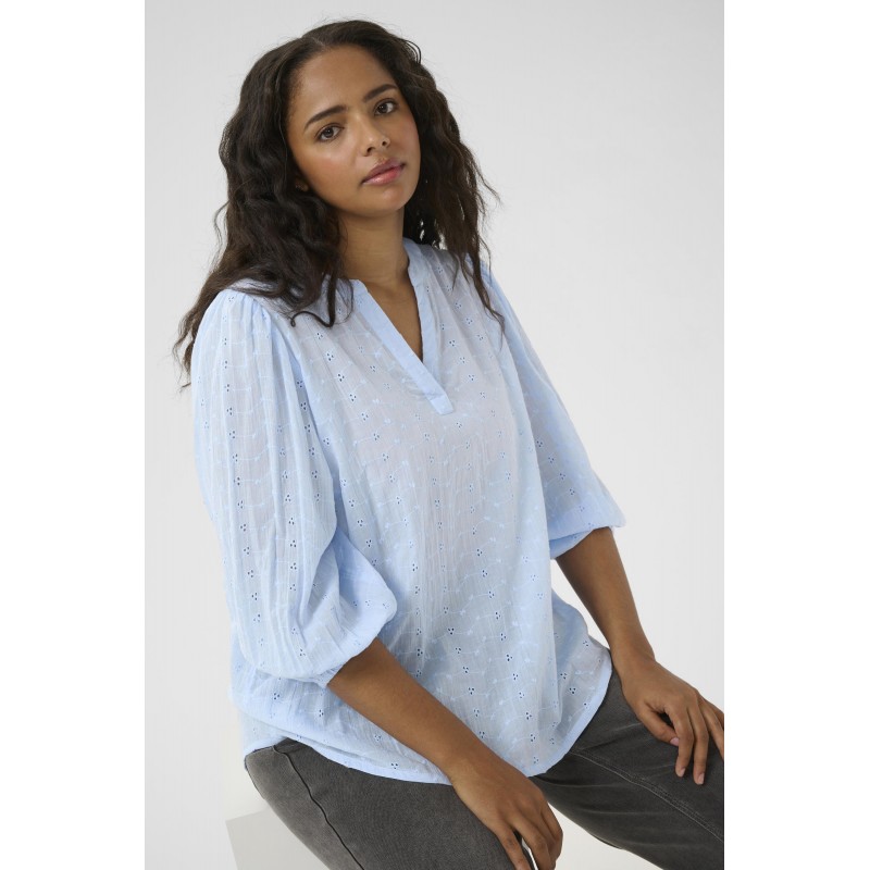 Sød bluse i en dejlig bomuldskvalitet, med et fint broderet hulmønster. KCmaia blusen har V-udskæring og er med 3/4 ærmer der giver en lille pufeffekt og afsluttes med elastik kant.